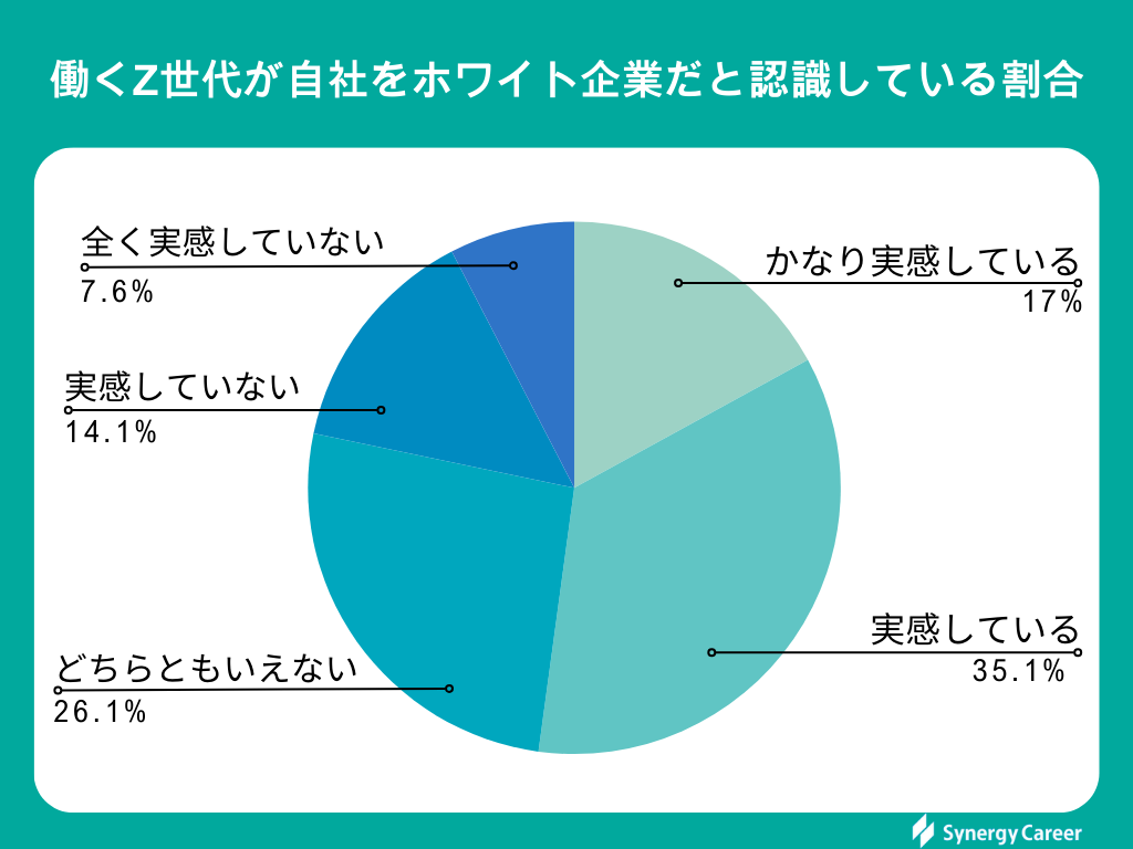 自分の会社がホワイト企業だと「かなり実感している」割合は17%、「実感している」割合は35.1%でした。意外にも過半数を超える人がホワイト企業だと実感していることが分かりました。