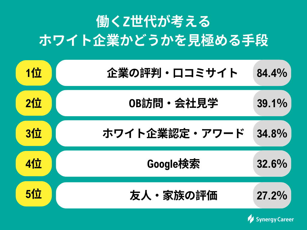 働いている会社がホワイト企業だと実感してる割合や「評判口コミサイト」を信用している割合など:https://synergy-career.co.jp/media/zsedai-whitekigyou/