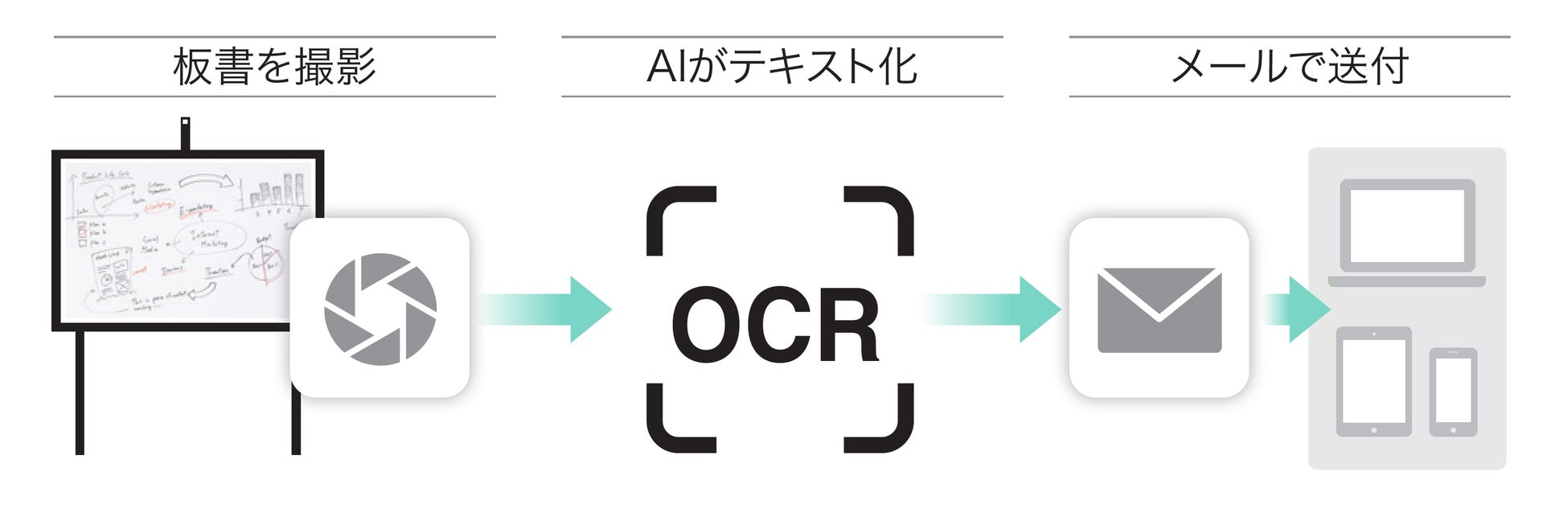 板面に書いた手書き文字を撮影し、OCR機能でテキスト化した文書をメール送付。議事録作成の手間を軽減します。