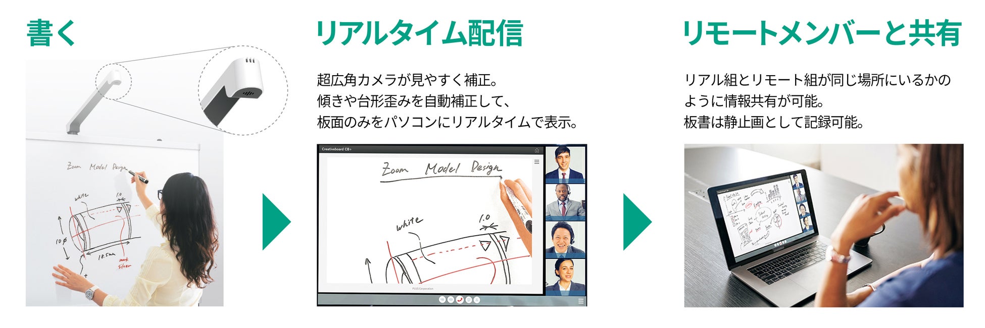 遠隔参加者が参加意識を高めながら議論への集中をサポートできるように、ボード上部に搭載された超広角レンズと補正機能を備えた専用カメラが、板面全体を見やすく映し出し、LAN経由でリアルタイムにリモート参加者のパソコン画面に表示します。書く人が板面にかぶって見えないことによるストレスも解消します。