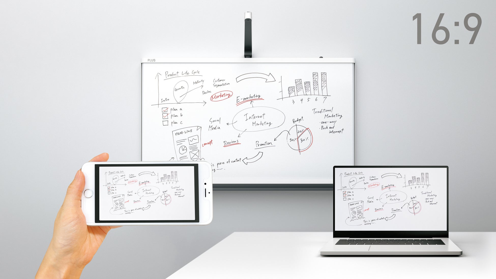 1975年、プラス株式会社では、あるプロジェクトミーティングが日夜続いていました。当時、ホワイトボードに書かれたその日の議論を手間なく残せると使用されたのがインスタントカメラ。しかし、写真が小さく、文字が見えにくいという問題も…。