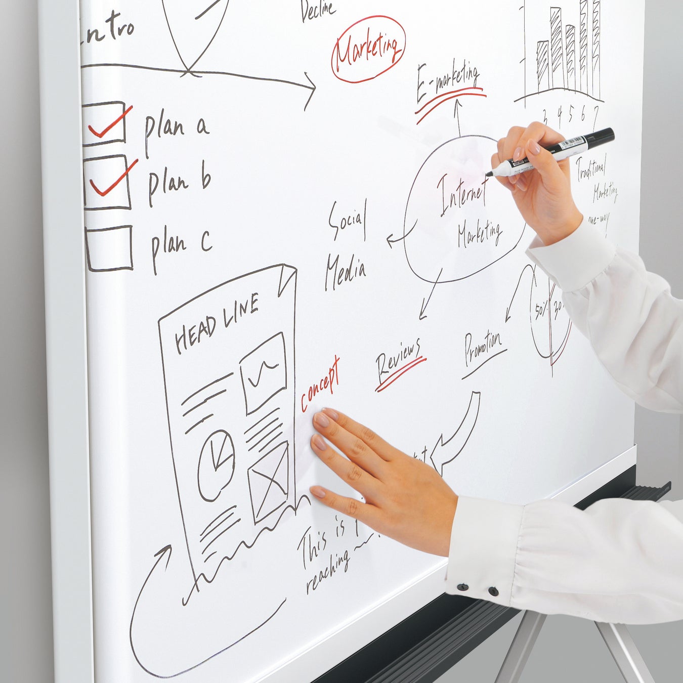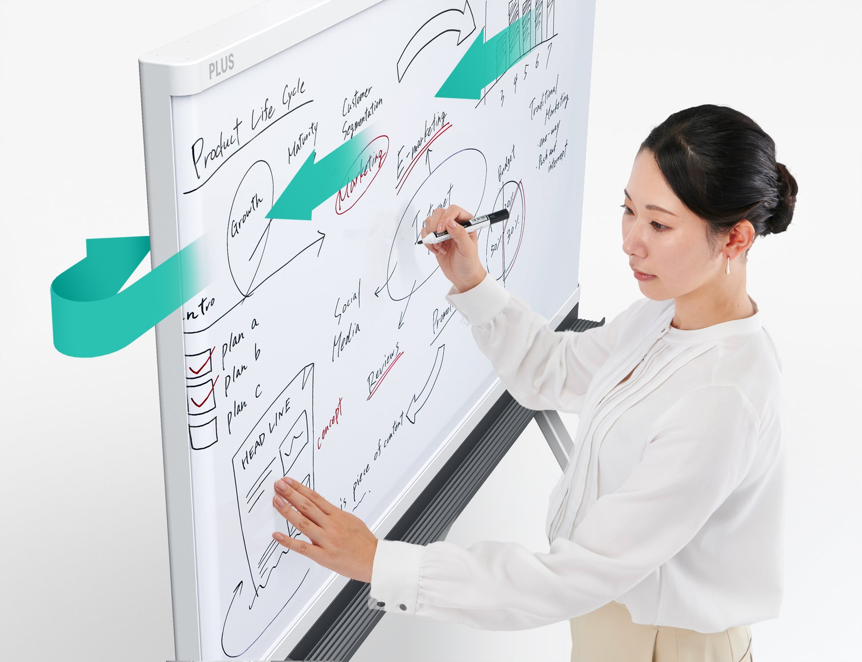 この悩みがきっかけとなり、1984年に内蔵のスキャナーがスクロールする板面を読取り、印刷するコピーボードが誕生しました。それ以来、プラスのコピーボードは、国内トップシェアを維持しながら絶えず進化を続け、働き方が大きく変化した今、読取り方式も一新、クリエイティブボードとしてさらなる革新を遂げています。