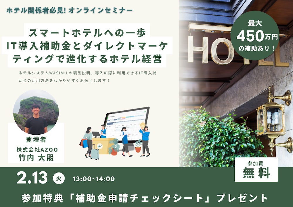 【2/13 (火) 参加無料】「スマートホテルへの一歩:IT導入補助金とダイレクトマーケティングで進化するホテル経営」セミナー開催のお知らせ