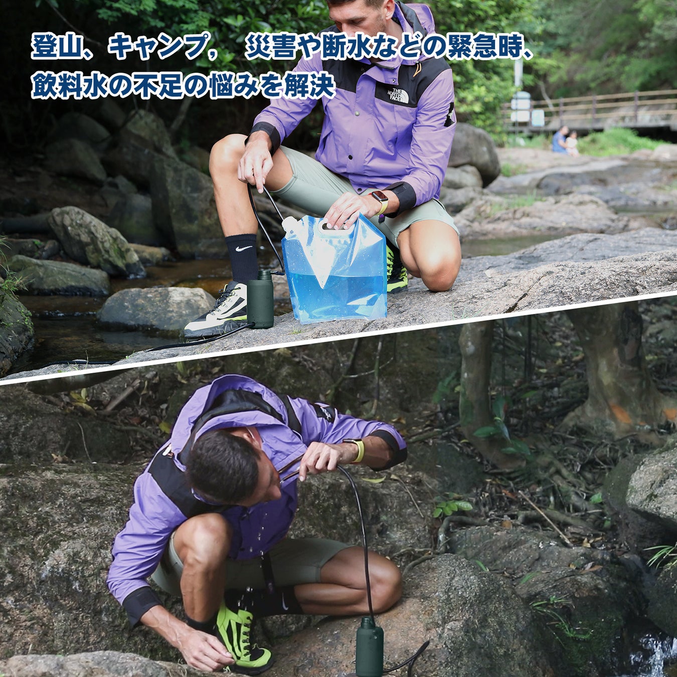 コンパクトなデザインで重さわずか350gの超ポータブルデバイスです。また、安全に保管できる専用の収納袋が付いており、フィルターは取り外し可能で、古いフィルターを簡単に交換することができ、長期間使用できます。 アウトドア用のリュックサックやバッグのベルトにも簡単に掛けられるので、旅行中の持ち運びや保管に便利便利です。キャンプ、登山、釣り、探検、サバイバルなどのアウトドア活働に適しています。