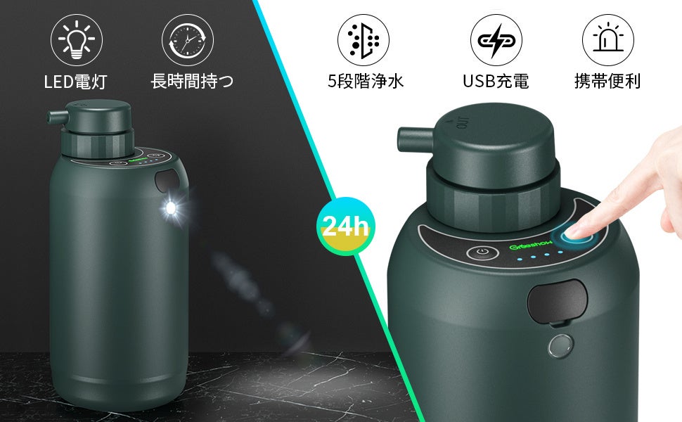 【13%OFF!!! アマゾン時間限定セール予告】GreeShow 業界新発想 携帯浄水器 アウトドア USB電動 LED電灯 インクグリーン プロが信頼する浄水性能の携帯浄水器 !