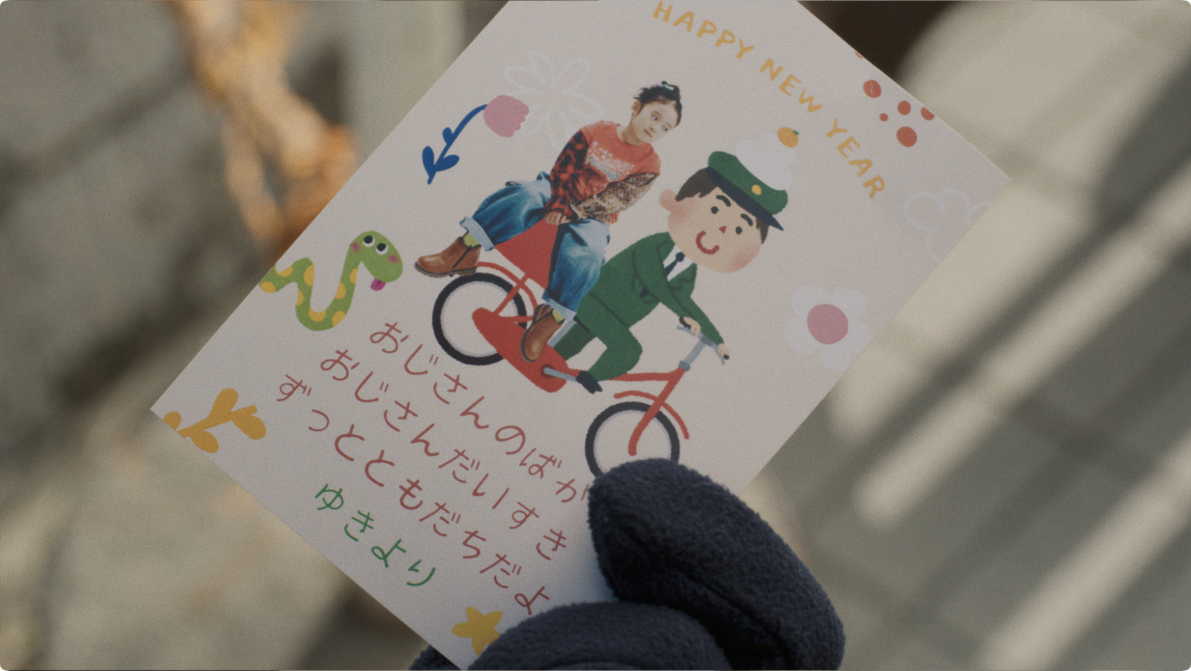 物語の舞台は美しい島。小学生の女の子ゆきちゃんと島の郵便屋さんが主人公のストーリーです。島の海辺のバス停で毎日顔を合わせるふたりの間には、年の離れた友情が育まれていきます。しかしある日、郵便屋さんがもうすぐ退職することを知ったゆきちゃんは、寂しさから心にもないことを言ってしまいます。ゆきちゃんは仲直りのためにCanvaを使い、郵便屋さんへの感謝の気持ちと二人の絆が表現された手作りの年賀状を作成します。本作は、日本の伝統的な文化に新しい息吹を吹き込み、Canvaを通じて誰もが大切な気持ちを形にする力を持てるというメッセージを伝えています。