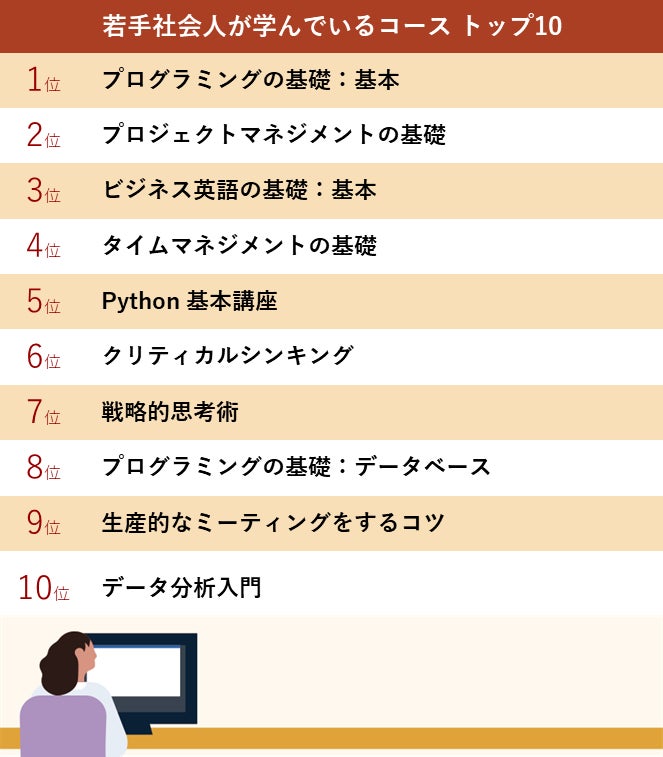また、「プロジェクトマネジメントの基礎」(2位)、「タイムマネジメントの基礎」(4位)、「生産的なミーティングをするコツ」(9位)など生産性や効率に関するスキルを高めるためのコースも、若手社会人の間で需要が高いことがわかりました。