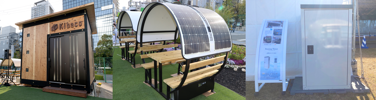 災害が起きた際に電気や水が得られなくなったとしても、太陽光発電や空気から水を作る技術をトレーラーハウスなどに搭載することで、自給自足を可能にする「オフグリッド」アイテムを実際に見て触れて体感いただけます。