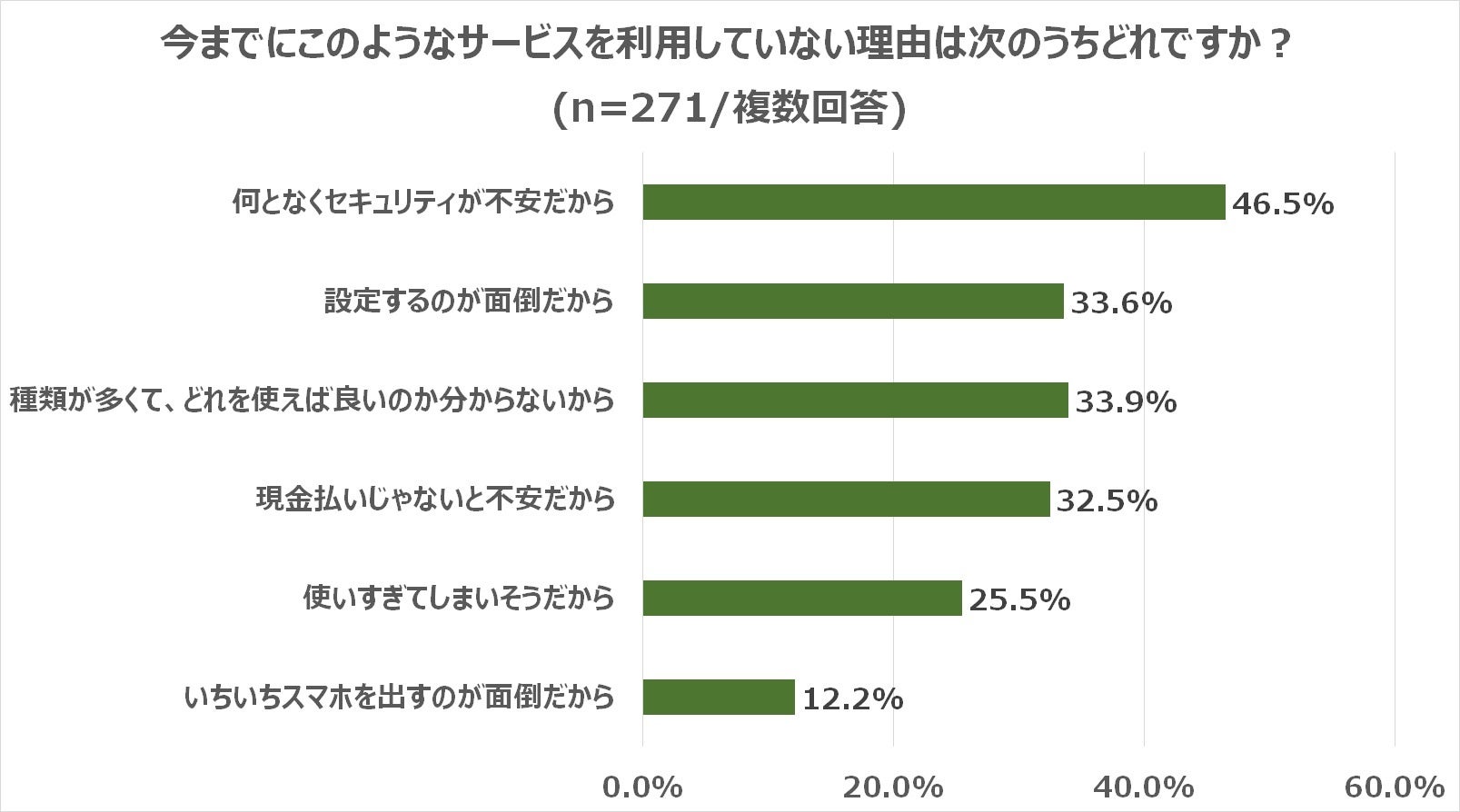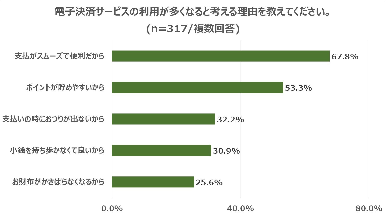 未利用者も含めた全体の73.3%は今後利用頻度が上がると回答しています。その理由として67.8%の人が「支払いがスムーズで便利だから」と回答していることから、利用経験者の満足度が高いだけでなく、未利用者からの同サービスに対する興味関心も高いことがわかります。