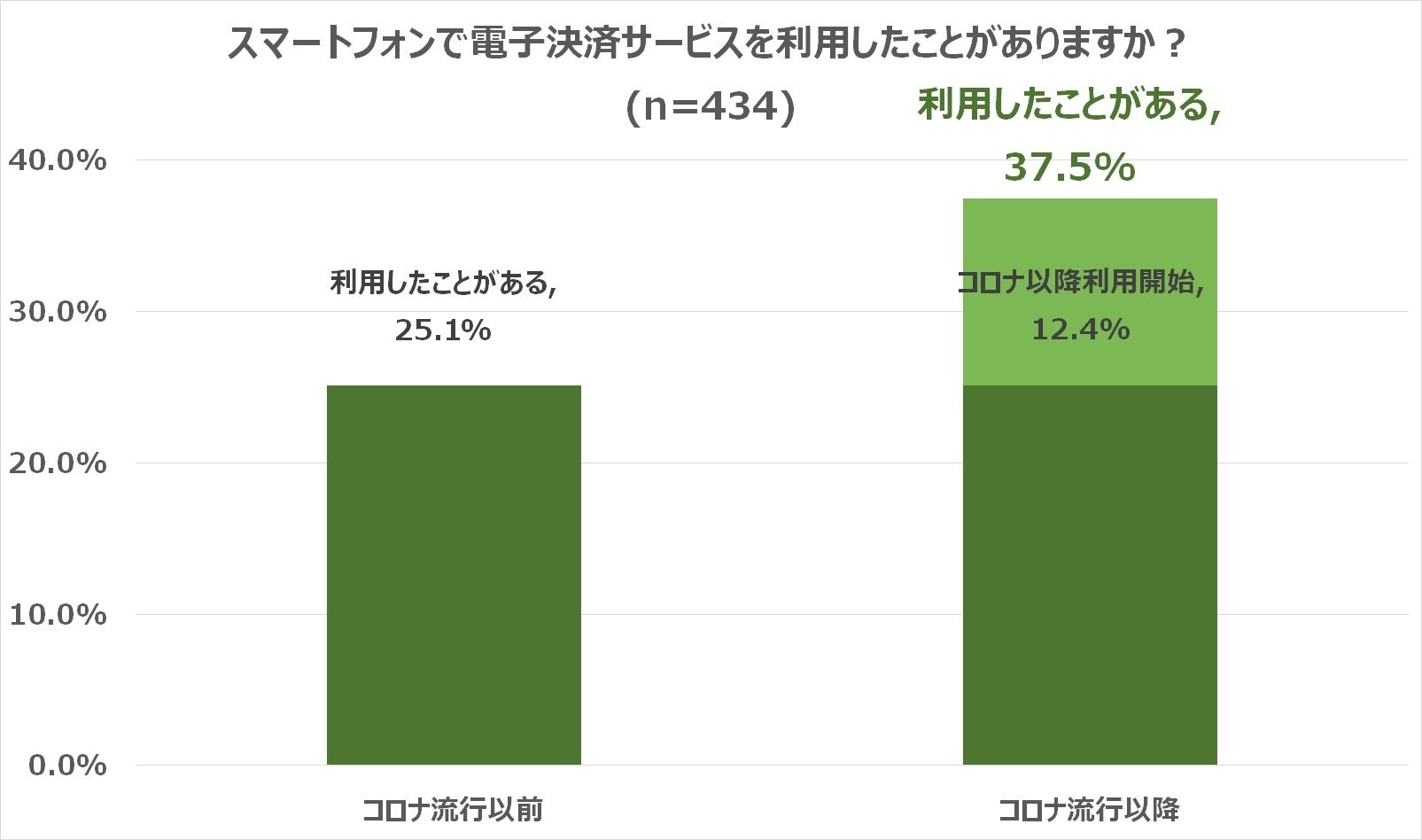 スマートフォンでの電子決済サービスはコロナ以降に12.4%の人が利用を開始しており、合計の利用者は37.5%になります。