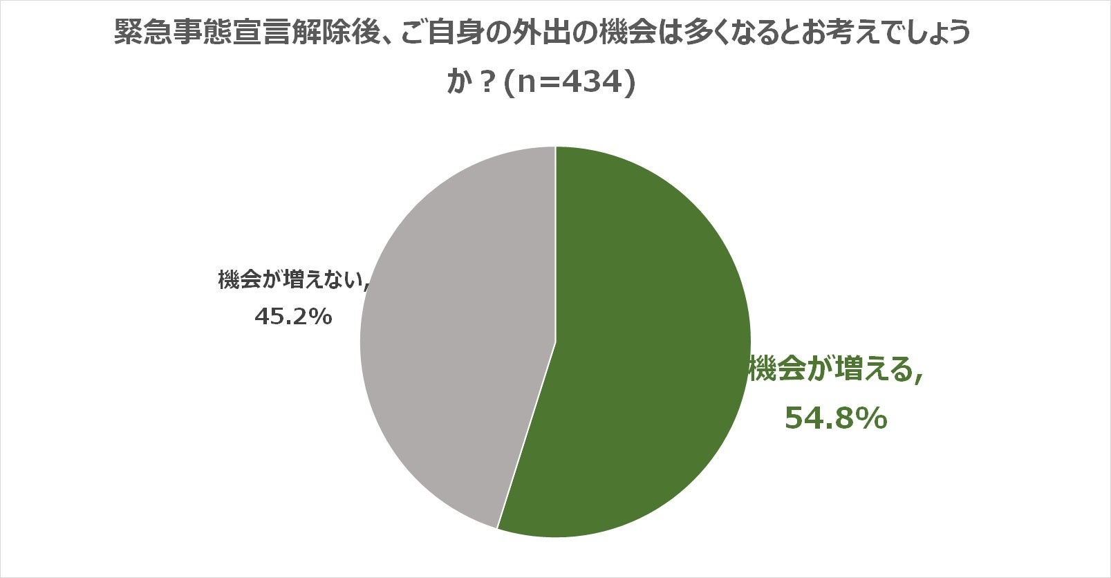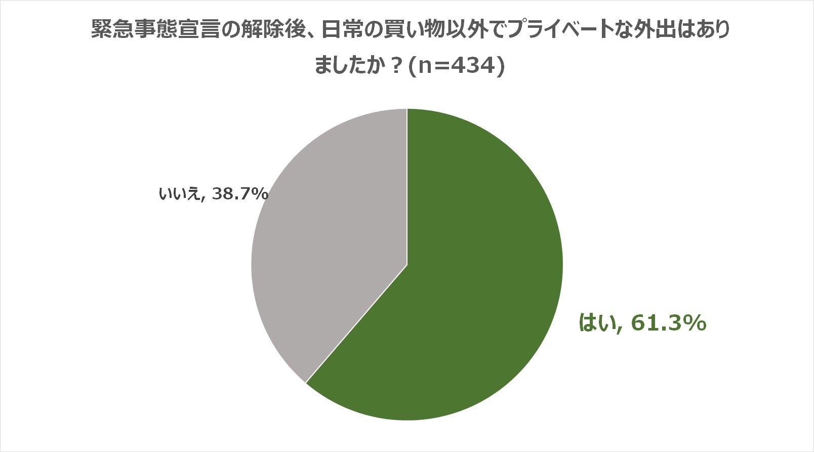 緊急事態宣言の解除をきっかけに61.3%の人が外出行動を開始しています。また外出の理由としては「知人・友人と会うため」45.9%、「外食・レストランに行くため」39.5%と続き、オフラインのアクティブな行動が徐々に再開されていく傾向がわかります。