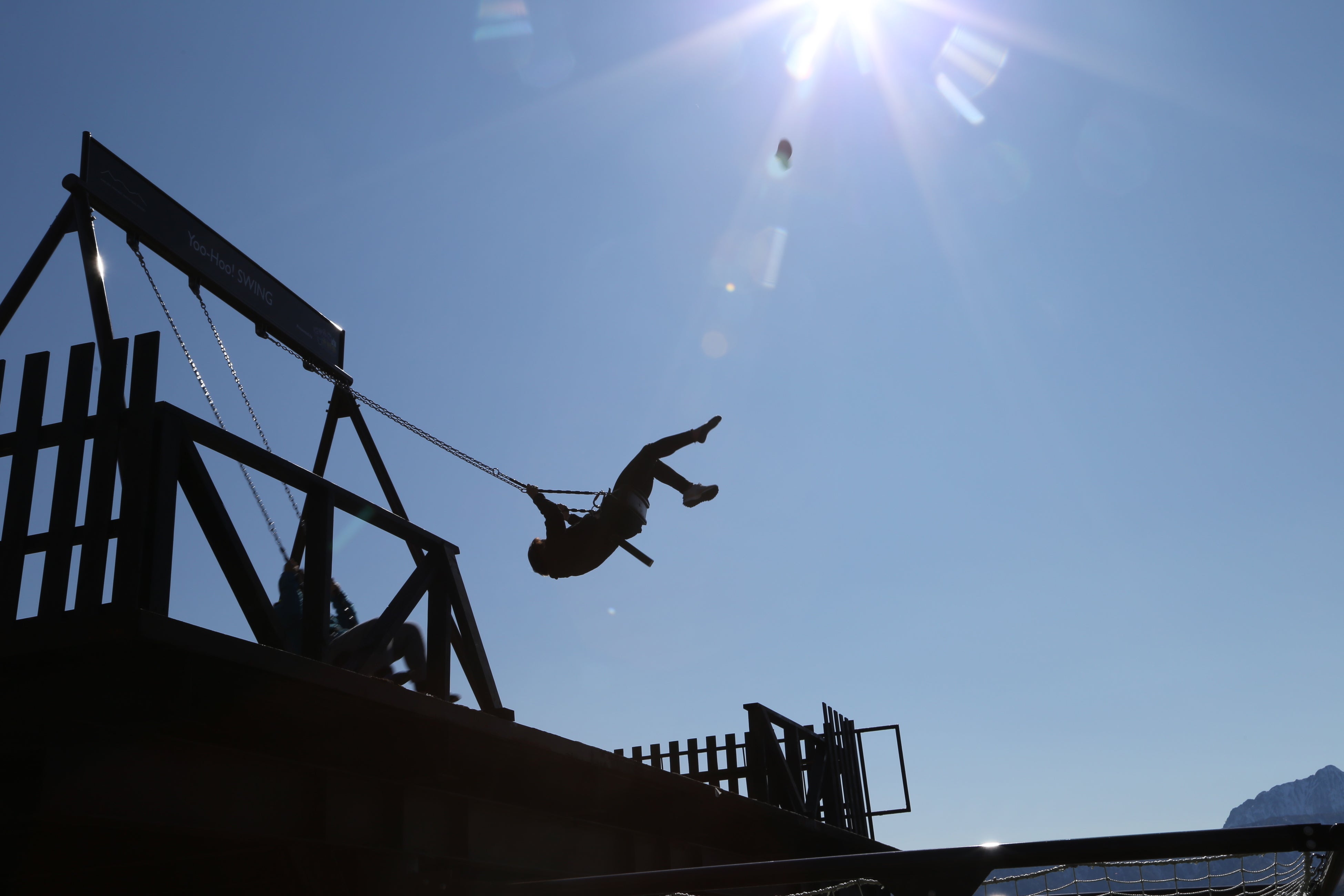 2020年より開催している「全日本靴飛ばし選手権大会」は、標高1,289mの白馬岩岳山頂にある絶景大型ブランコ「ヤッホー!スウィング presented by にゃんこ大戦争」から紅葉が色づく北アルプスに向かって専用の靴(スリッパ)を飛ばして、その飛距離を競う大会です。公園に設置されているブランコの約2倍の大きさを誇る、高さ約3.6m、横幅約4.5mのブランコから30秒の助走後5秒以内に全力で靴を飛ばすルールで、身長別の3クラス(「アルプスの少女・少年」「アルプスの若者」「アルプスの大人」)に分かれて競い合います。