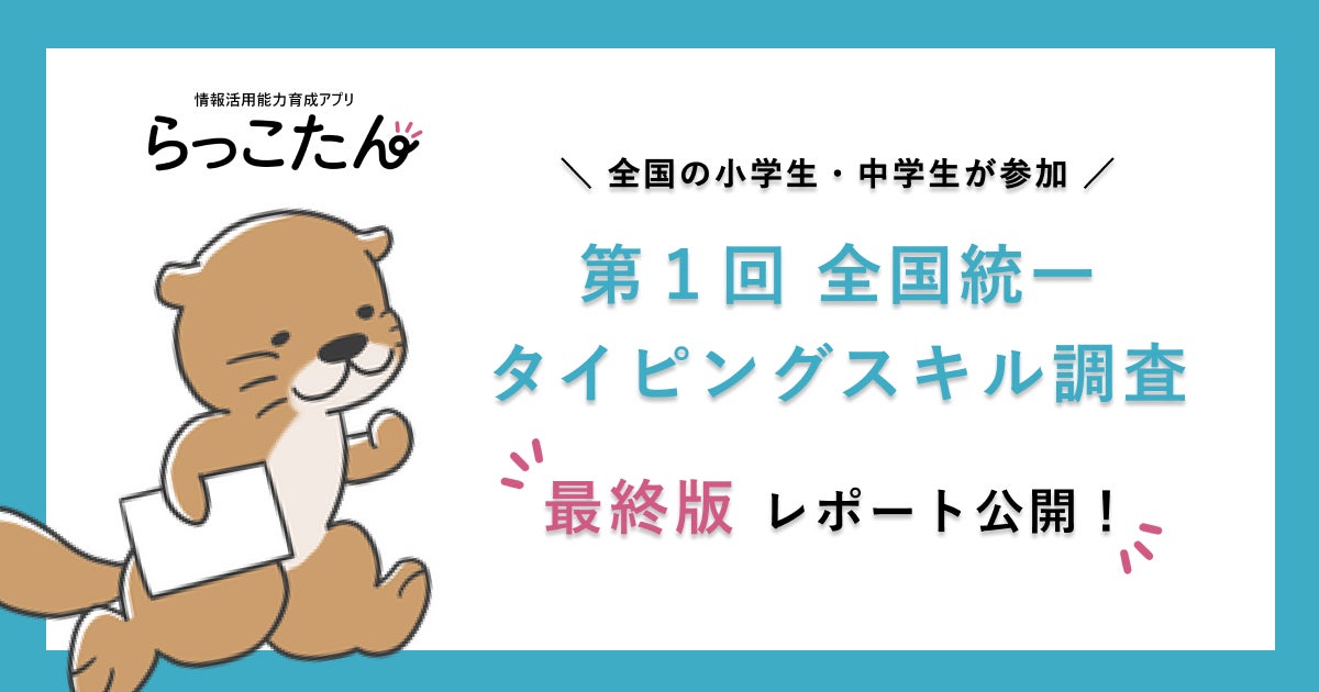 自治体向けサービスを開発する株式会社ミラボ(本社:東京都千代田区、代表取締役:谷川一也、以下「ミラボ」)と、情報モラル教育・プログラミング教育を手がける株式会社教育ネット(本社:神奈川県横浜市、代表取締役:大笹いづみ、以下「教育ネット」)は、共同開発したクラウド型デジタルAI教材「らっこたん」を使用した「第1回全国統一タイピングスキル調査」の最終結果を公開します。