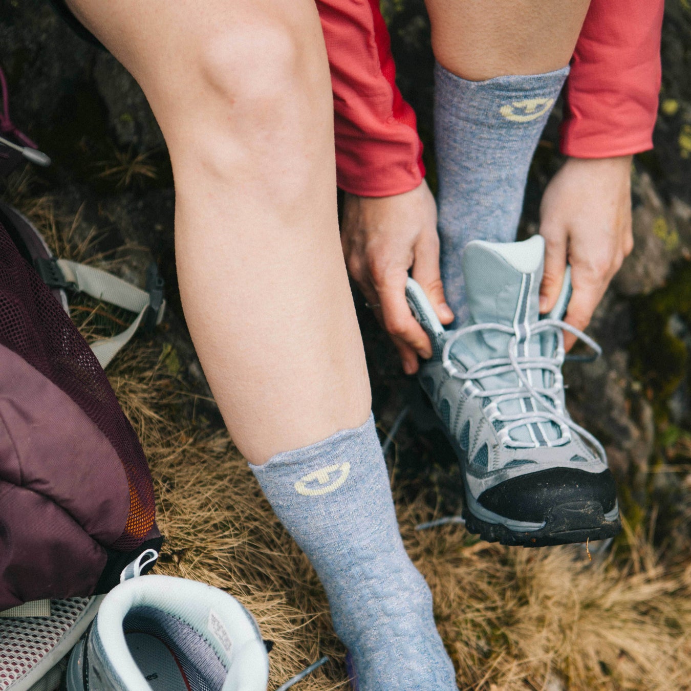 また、靴下選びの際は、ローカットのトレイルランニングシューズなどに適したアンクル丈、ミッドカットの登山靴に適したクルー丈と長さを意識する事で靴との摩擦や草木、小石からの小さな怪我の予防になります。そして、靴や足とのフィットを大切にするためにも必ずご自身の足のサイズに合った靴下を選んでください。
