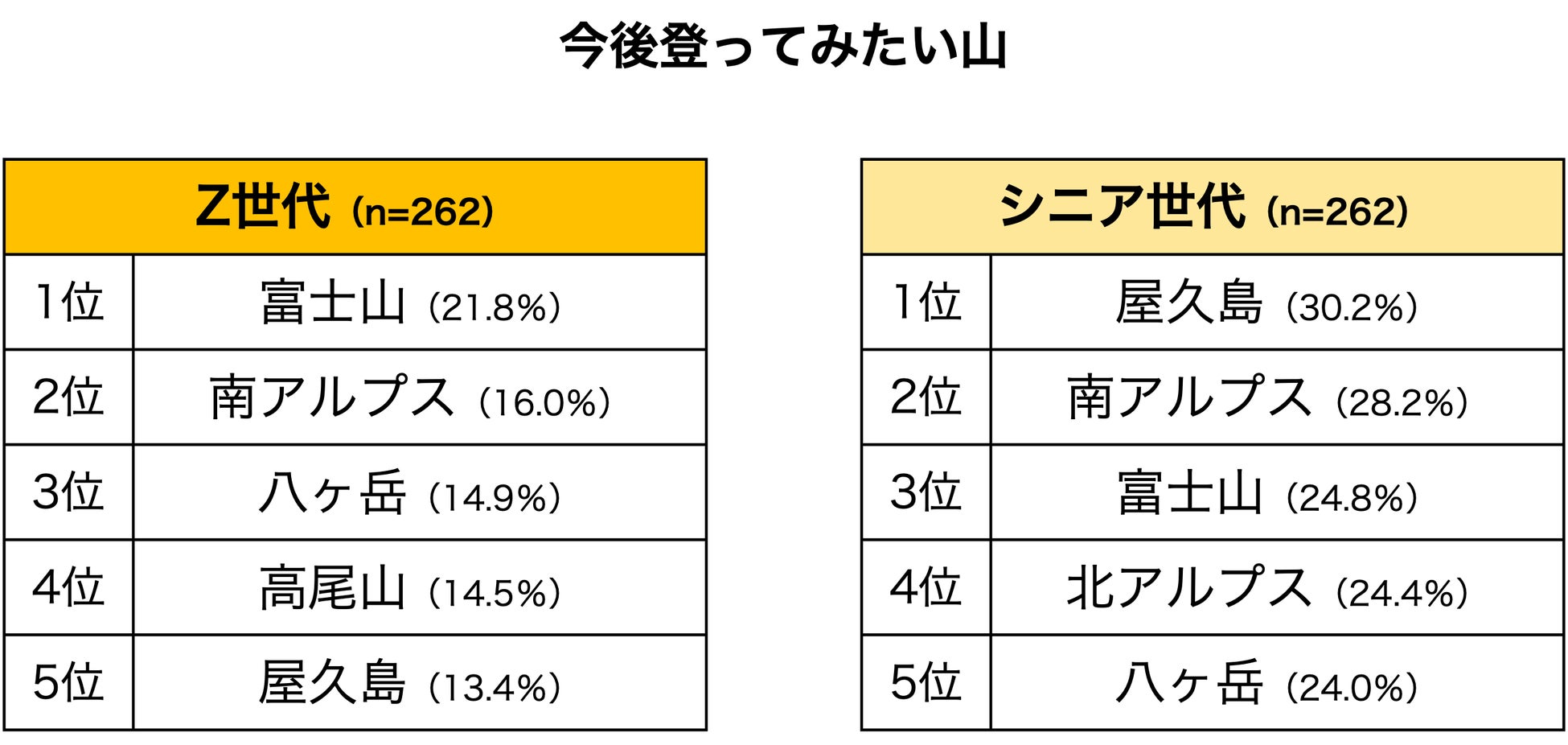 最後に、今後、登りたい山を尋ねたところ、シニア世代の1位は「屋久島(宮之浦岳)」(30.2%)、2位「南アルプス(甲斐駒ヶ岳、北岳など) 」(28.2%)、3位「富士山」(24.8%)が人気の山として支持を集めました。一方のZ世代では1位「富士山」(21.8%)が2位以下と5ポイント近くの差をつけて根強い人気がある結果になりました。