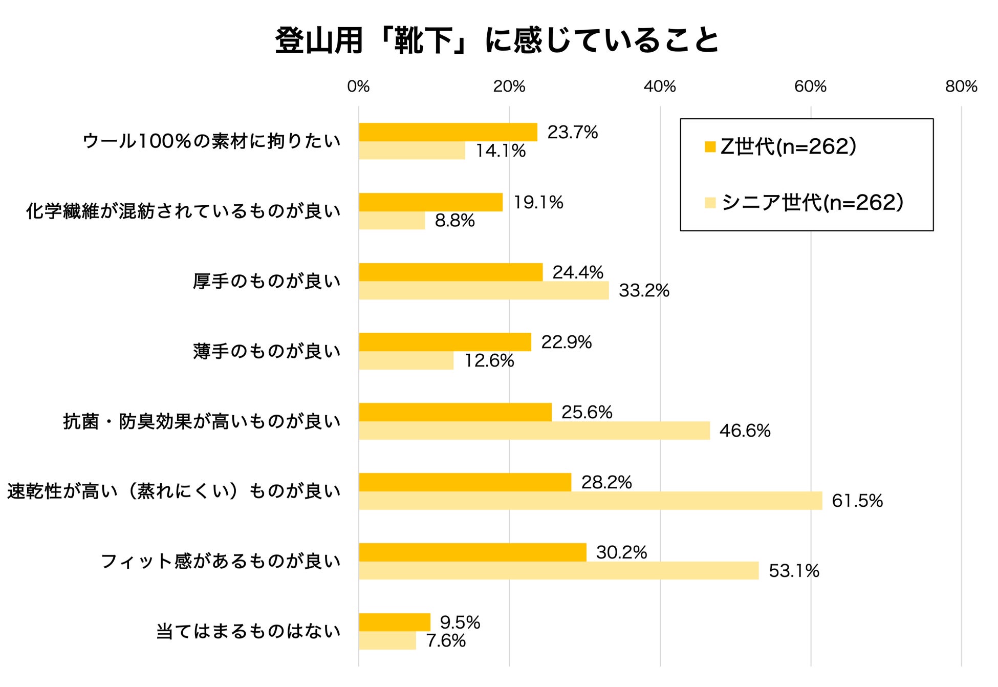 登山用靴下に対して「ウール素材」によりこだわるのはZ世代で4人に1人。シニア世代は「速乾性」、「フィット感」、「抗菌・防臭効果」へのこだわりが強い