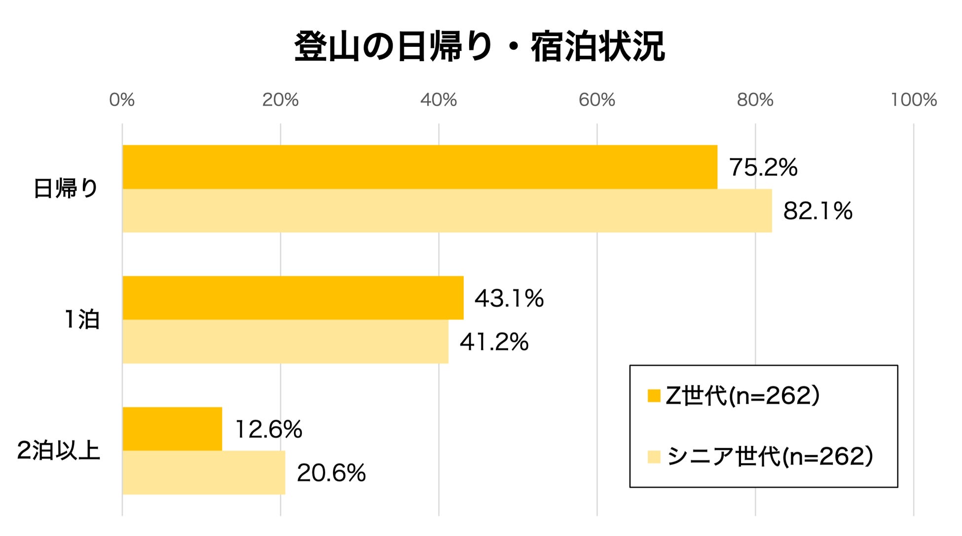 直近5年以内での平均的な登山回数が年1〜2回以上のZ世代・シニア世代の登山ユーザー524名(各世代262名)を対象に、登山の日帰り・宿泊状況を尋ねたところ、どちらの世代も「日帰り」(Z世代:75.5%、シニア世代:82.8%)が8割近くと最も多く、日帰りでの“ライト登山”が支持される結果となりました。2泊以上の登山の割合だと、シニア世代が約2割存在し、Z世代(12.8%)よりもやや多い状況です。
