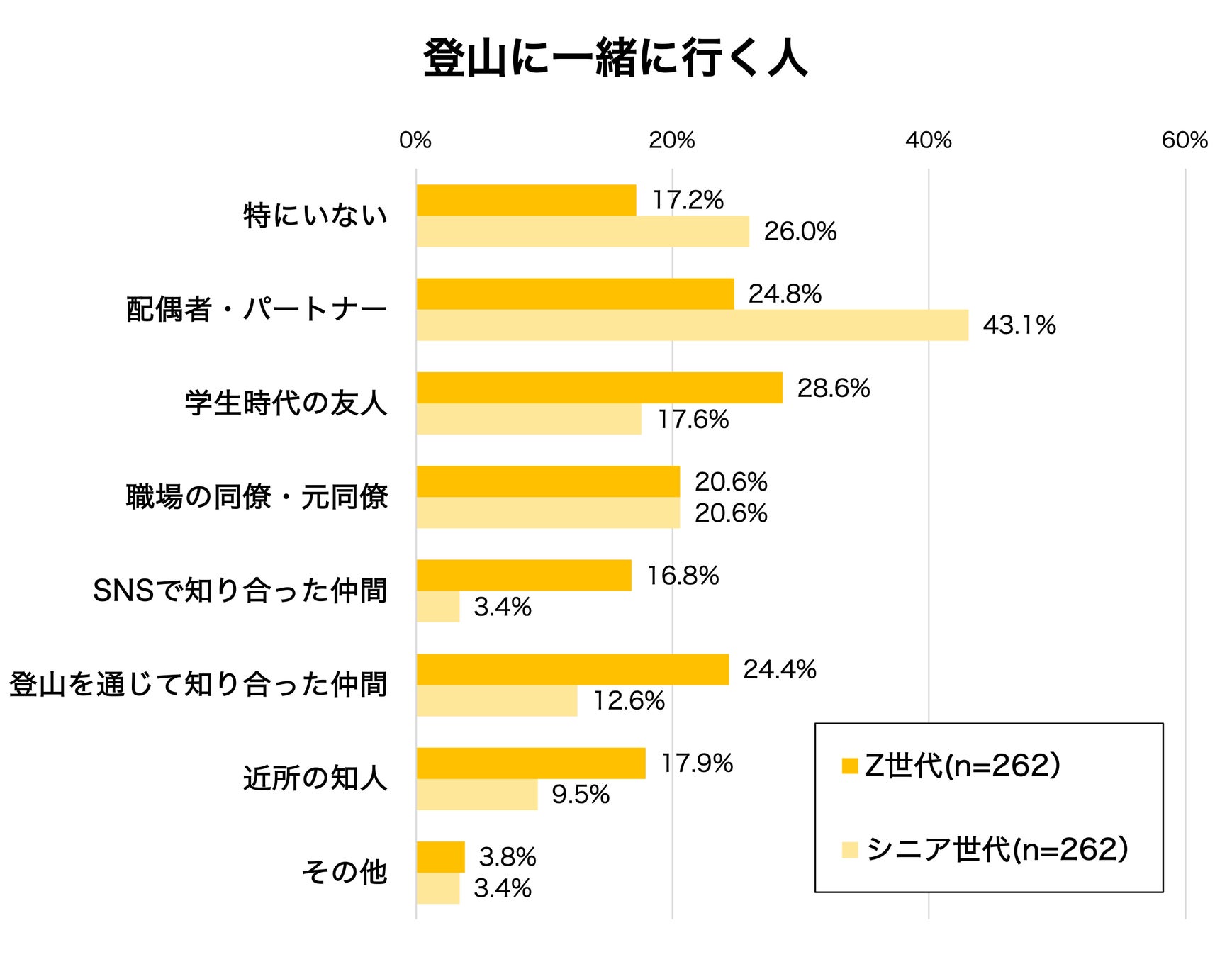 登山に一緒に行く人を尋ねたところ、シニア世代は「配偶者・パートナー」(43.1%)が最も多く、次いで「特にいない」という“ソロ登山派”が4人に1人いることが明らかになりました。一方のZ世代は「学生時代の友人」(28.6%)が最も多い中、「登山を通じて知り合った仲間」(24.4%)、「SNSで知り合った仲間」(16.8%)がシニア世代と大きく差をつけ、世代による登山仲間との繋がり方にも違いがある傾向が明らかになりました。