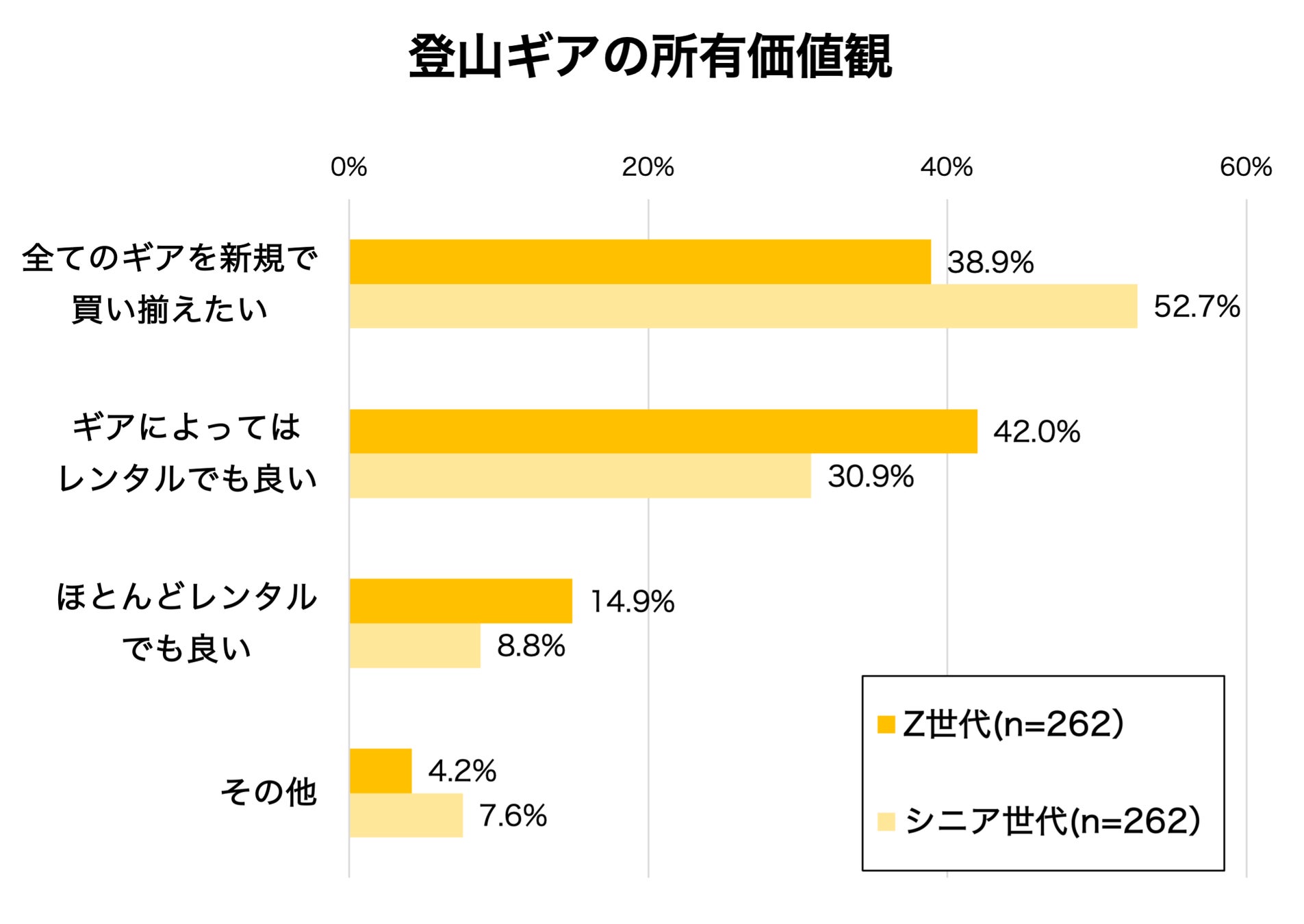 シニア世代の2人に1人が「全てのギアを新規で買い揃えたい」派。Z世代では「ほとんどレンタルでも良い」派が1割強存在