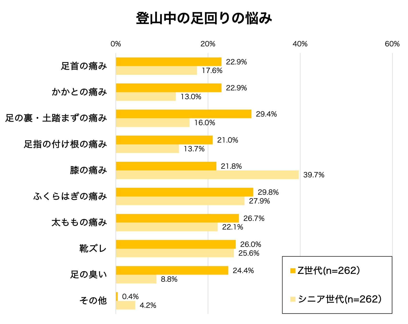 登山時の足回りの悩み、シニア世代は「膝の痛み」が圧倒的に多い。Z世代は「足の臭い」をシニア世代より気にする傾向に