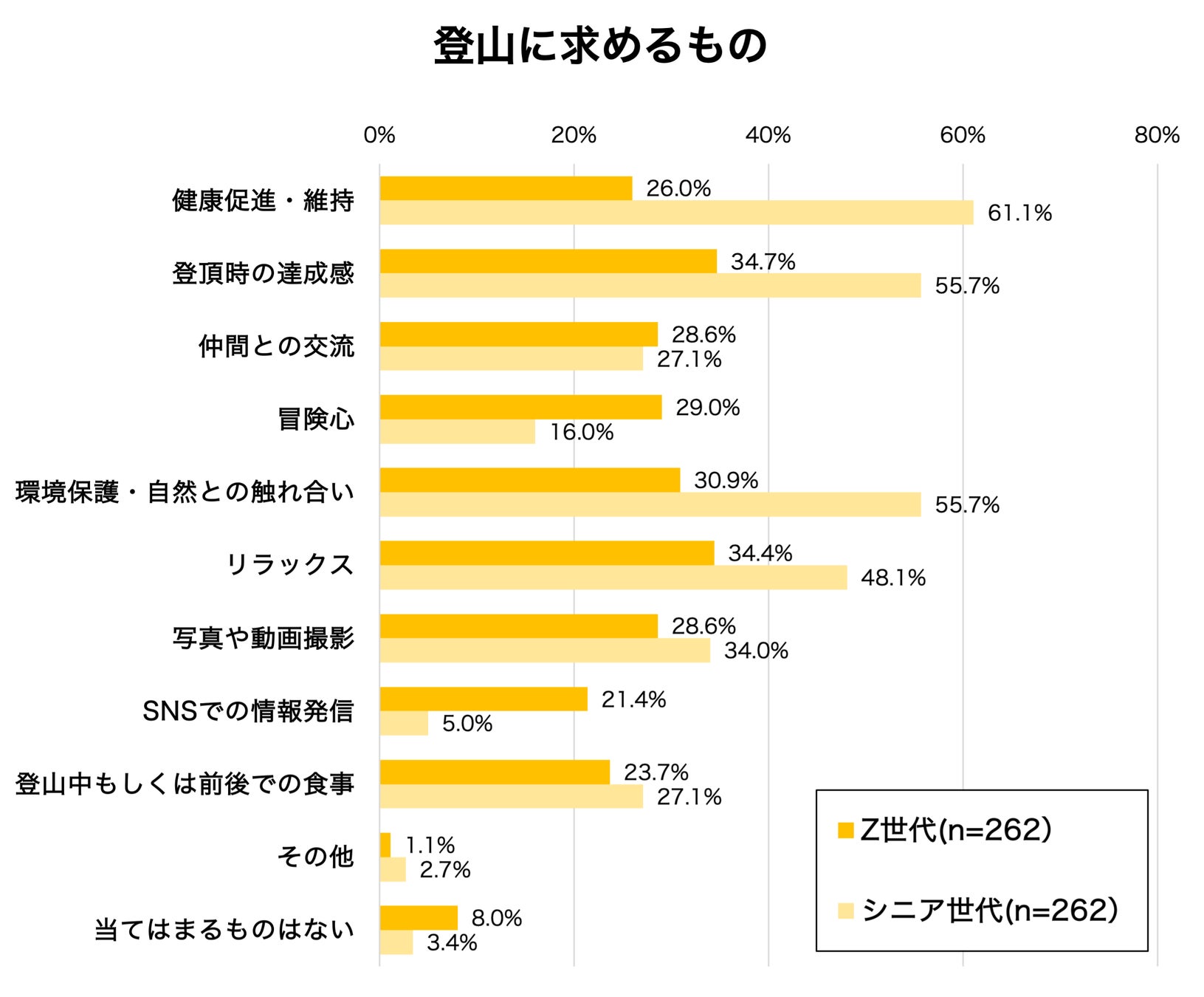 シニア世代が登山に求めるものは「健康促進・維持」「環境保護・自然との触れ合い」の一方、Z世代は「冒険心」、「SNSでの情報発信」が高い傾向に