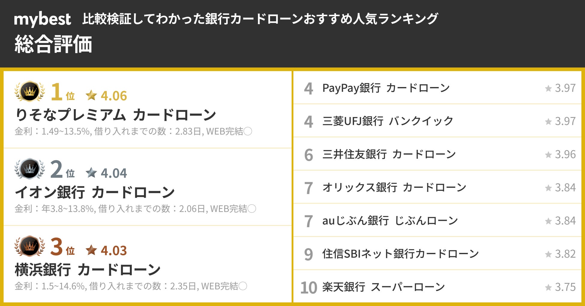 ■銀行カードローン総合評価1位は「りそなプレミアムカードローン」。トップクラスの低金利な点が高評価に。