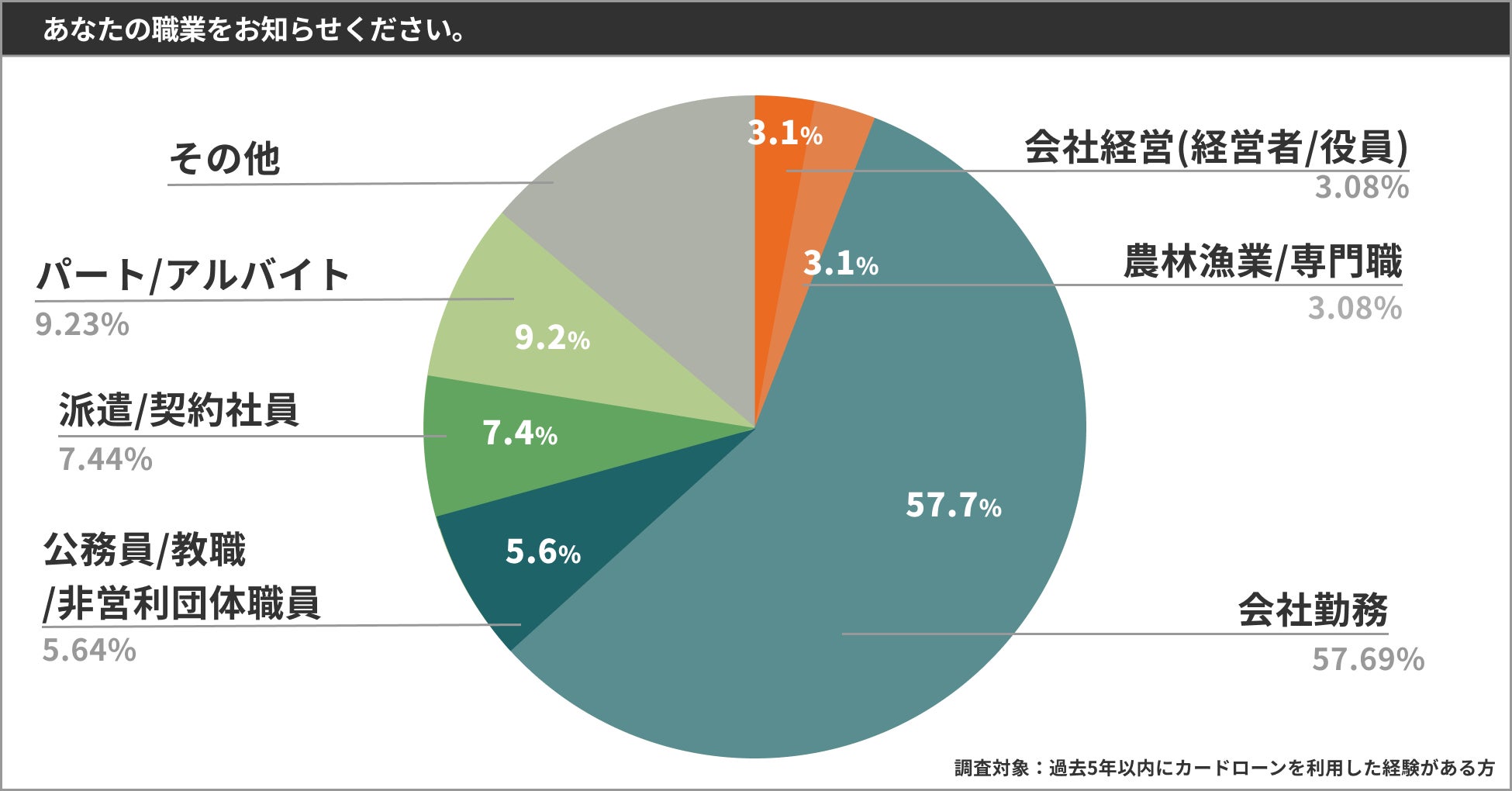 職業別のカードローン利用内訳は、「会社勤務(一般社員・管理職)」が57.7%を占めており、カードローン利用者の約6割が「会社員」という結果になりました。