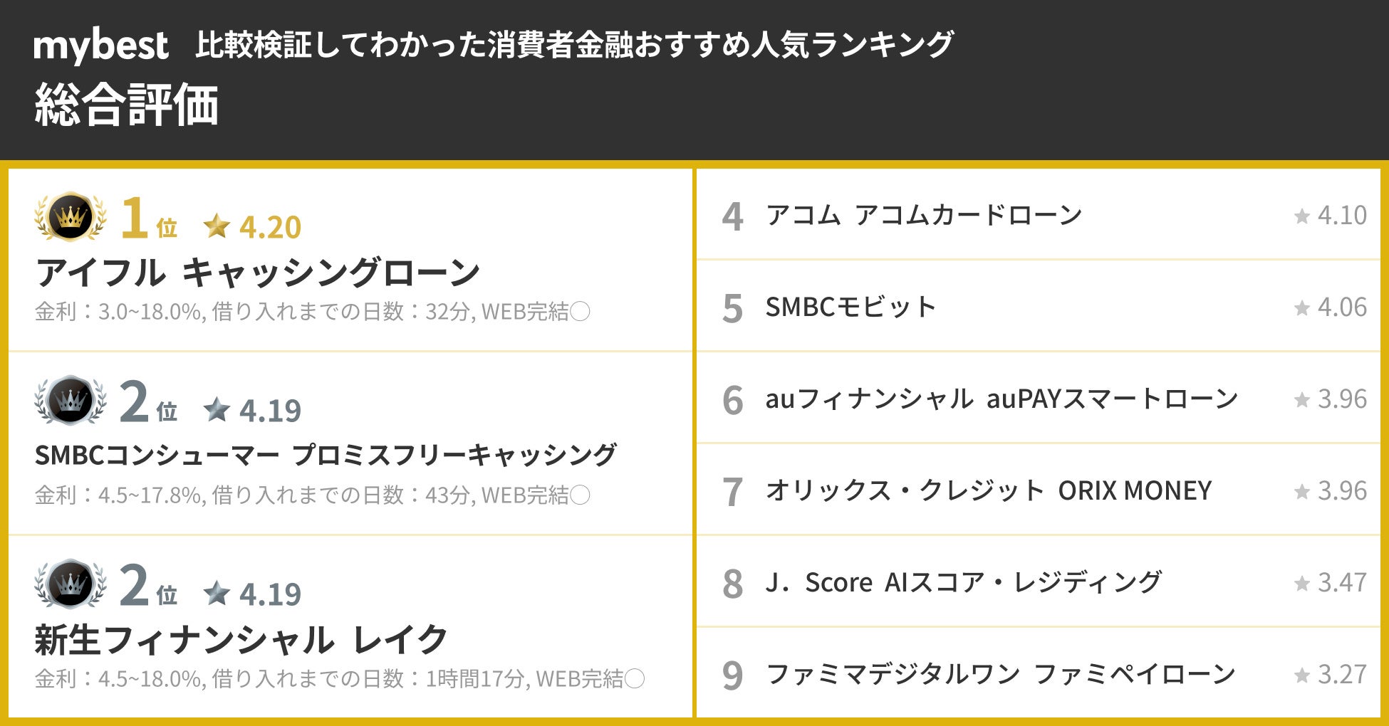 アンケートでの調査に加え、利便性・融資スピード・周囲へのバレにくさなどをmybestが独自に比較検証。