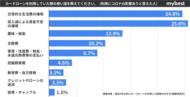 「利用にコロナが影響した」人だけで利用目的を抽出すると、「給与収入減少による資金不足の補填」を挙げた人の割合が25.6%、「日常的な生活費の補填」を挙げた人と合わせると50.4%と半数以上を占める結果に。