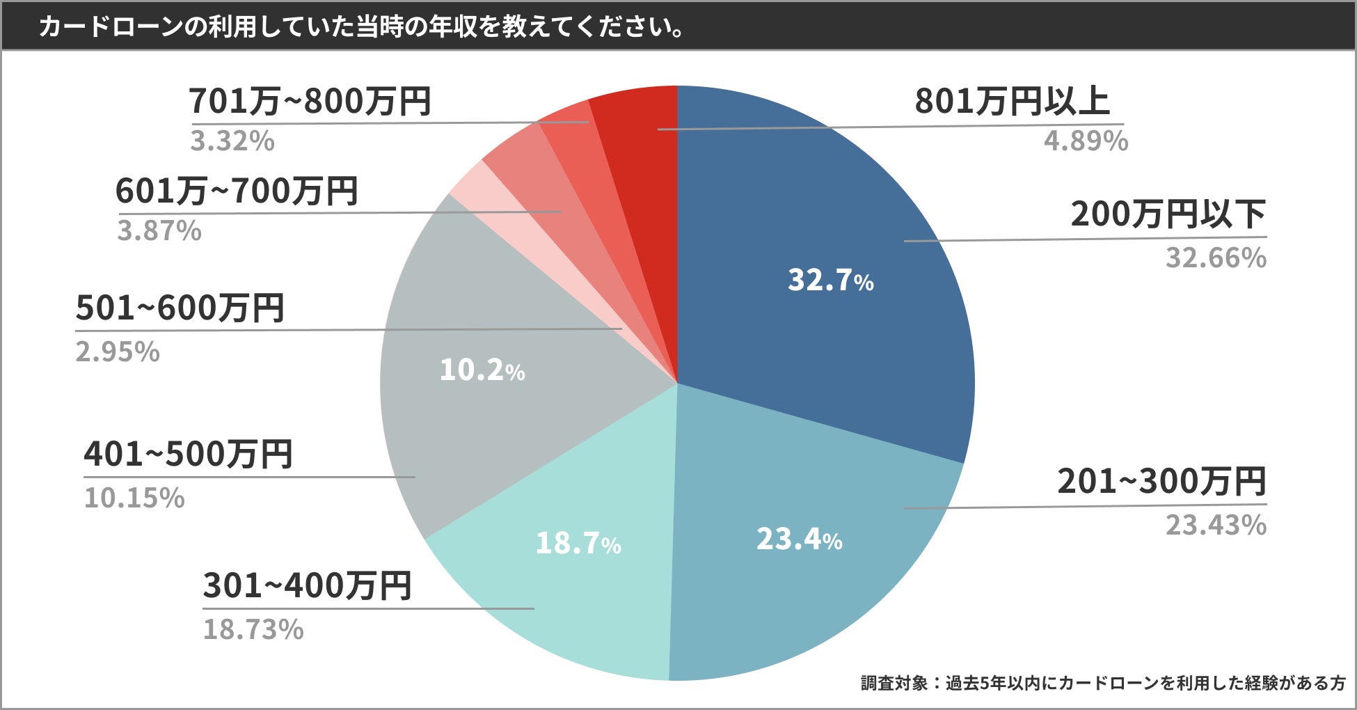 過去または現在にカードローンを利用した際の年収について調査したところ、「年収200万円以下」の低所得者層の利用が32.7%と最も高くなりました。