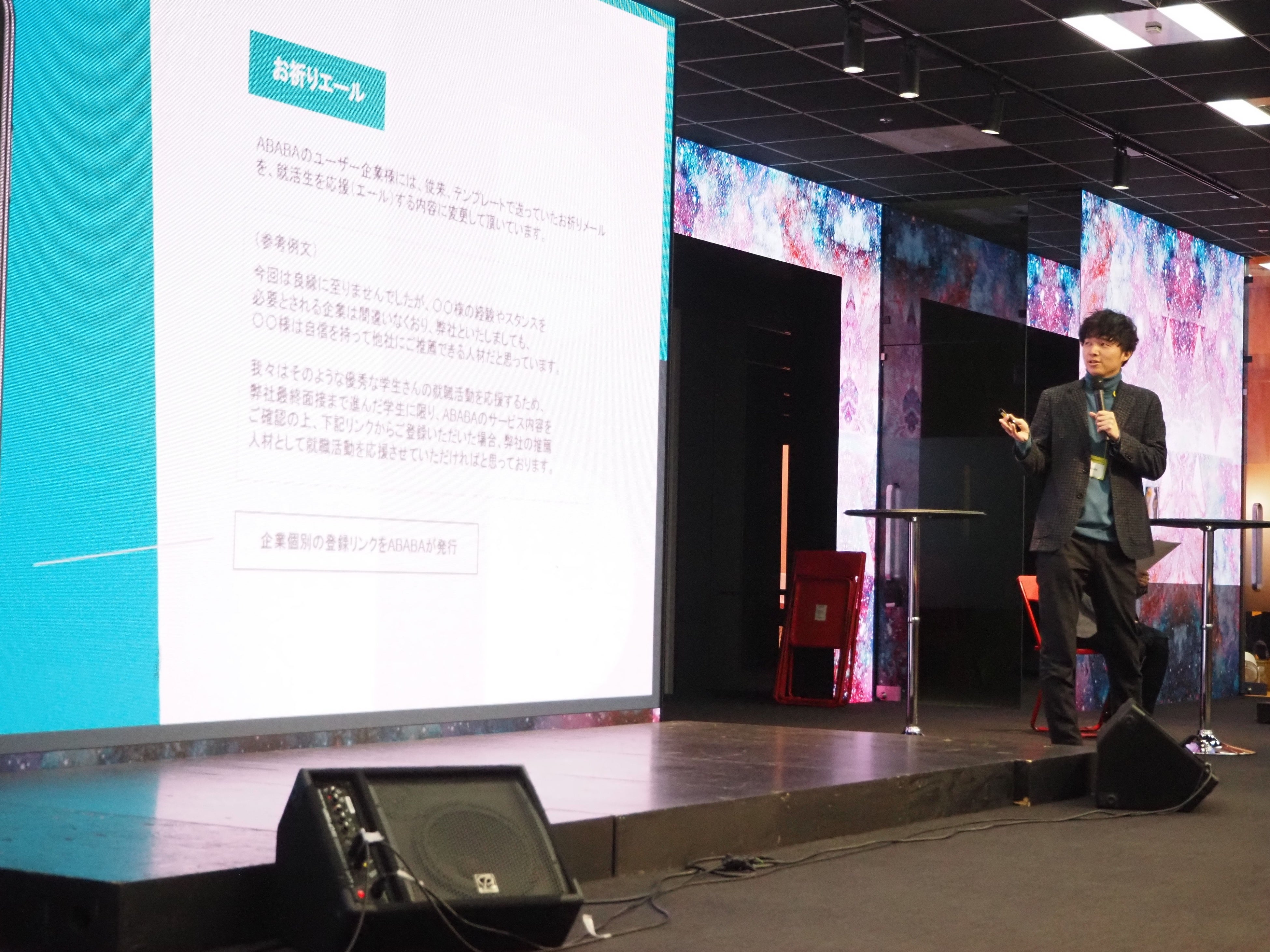 当社は、「不採用時に送られる『お祈りメール』を応援の『エール』に変え、就職活動の過程が評価される社会を実現する」とプレゼンテーションしました。「お祈りエール」は就活生を応援するだけでなく、企業にとっても優秀な人材の採用活動に役立ちます。