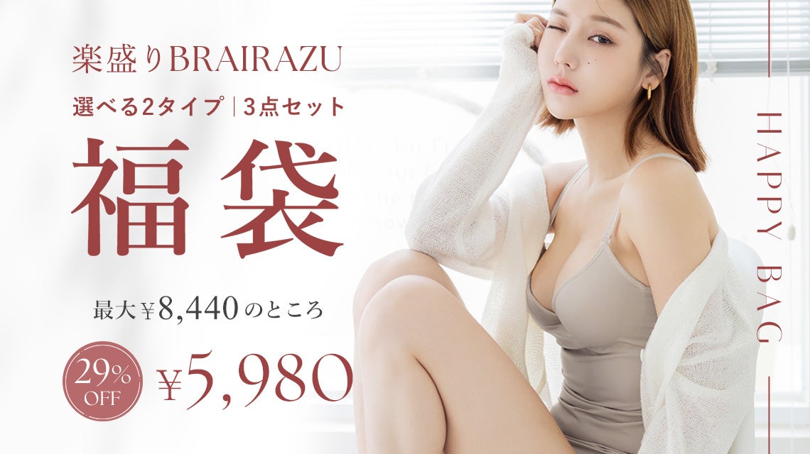 累計売上枚数100万枚突破の大ヒットアイテム、BRAIRAZUシリーズ。3枚で通常最大8,440円のところ、福袋価格5,980円で新登場!バストを下からグッと持ち上げ、くっきり谷間を作る「ワイヤー入りタイプ」と、締め付け感なくナチュラルに盛れる「ノンワイヤータイプ」から、好みに合わせて選ぶことができます。