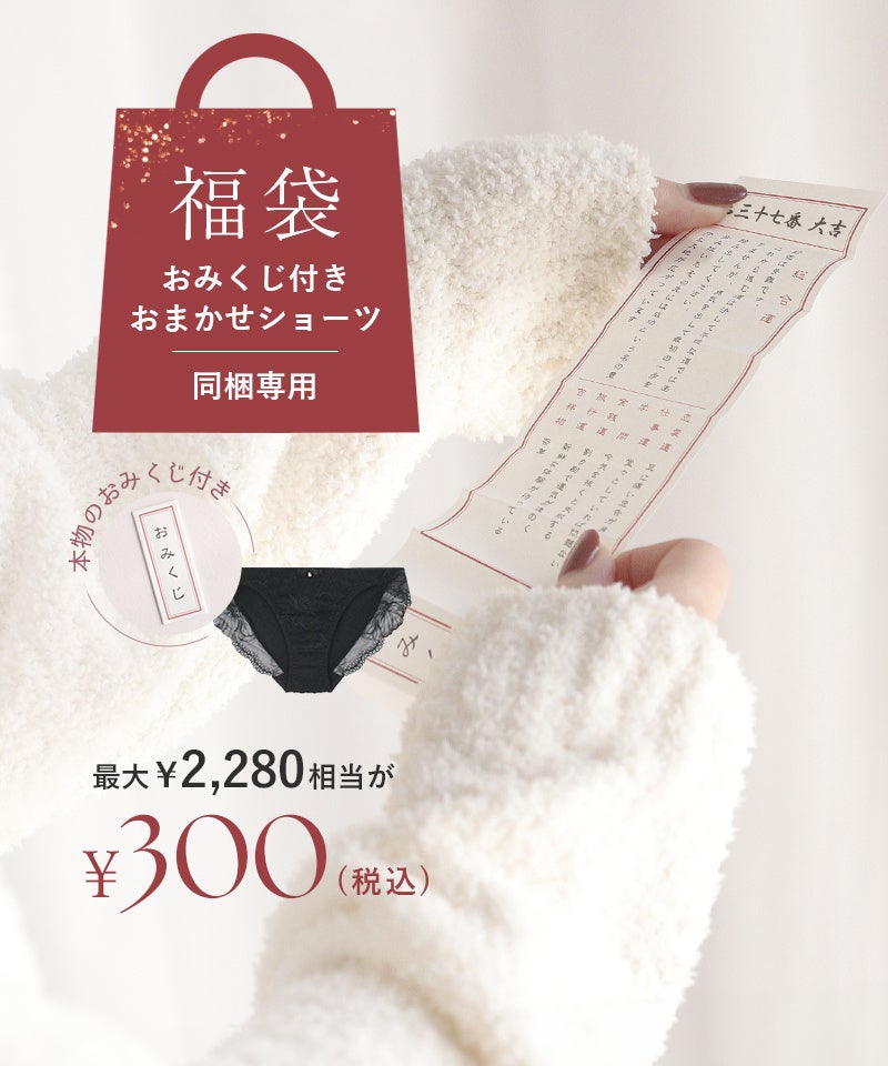 最大2,280円のショーツが福袋価格で300円と、とてもお得な福袋です。さらに、本物のおみくじ付きで新年の運試し。素敵なランジェリーとともに、新年のワクワクをお届けします。
