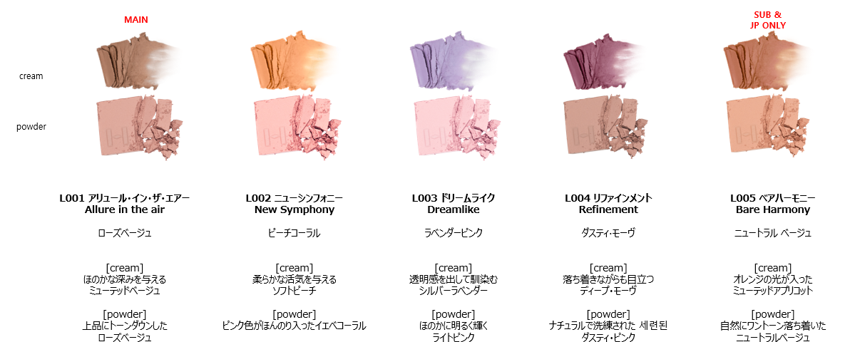 2色のチークは、それぞれパウダーとクリームのテクスチャーとなっており、合わせて使うことで立体感を出すことはもちろん、密着力と持続力を高めてくれます。使用する量の比率次第で、多彩なムードを演出できるのもポイントです。カラーラインナップは、それぞれ独得なニュアンスを演出してくれる日本限定色を含む5つのバリエーションをご用意しました。