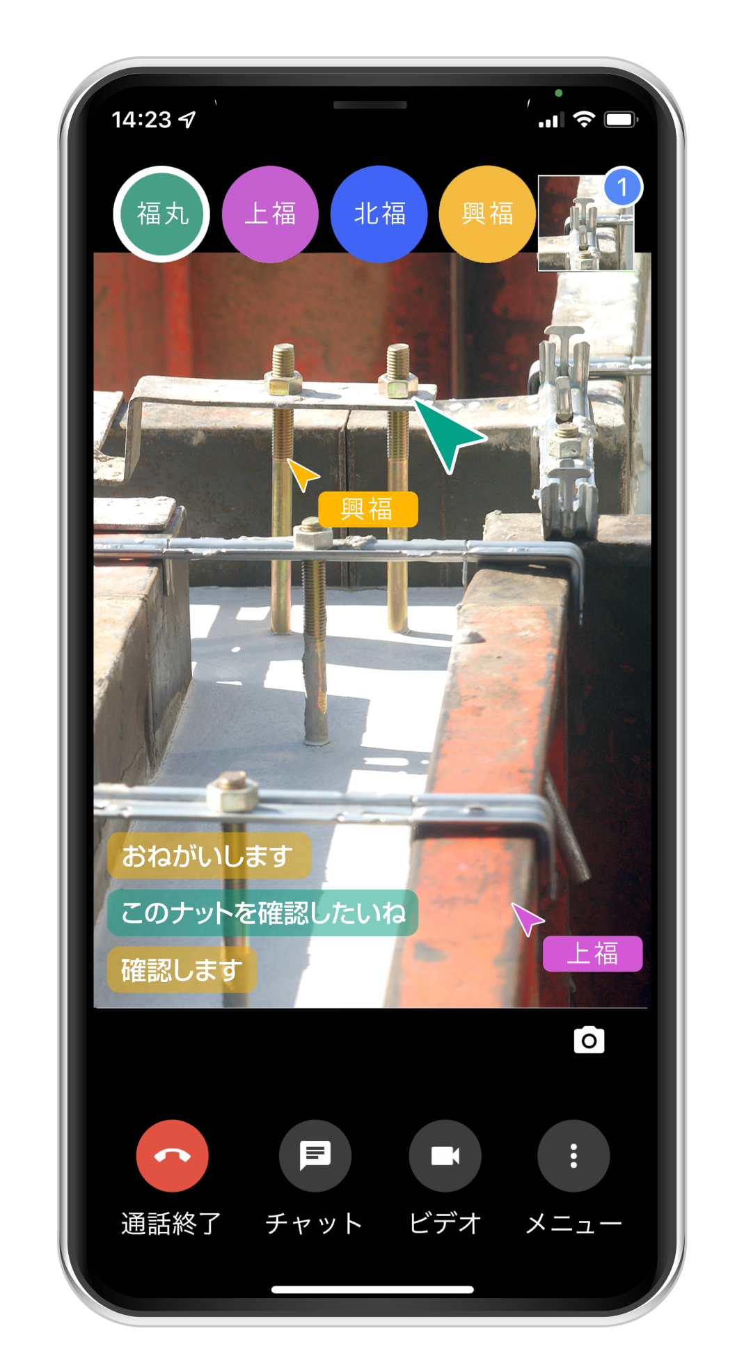 騒音対策、発着信機能、指示者からの遠隔撮影、現場ごとのグループ管理など、現場に寄り添ってこそ生まれた機能が多く搭載されており、オフィスワーカー向けのビデオ通話ツールでは実現できなかった現場の遠隔支援が可能になります。製造業やメンテナンス業、建築業、行政など導入されています。
