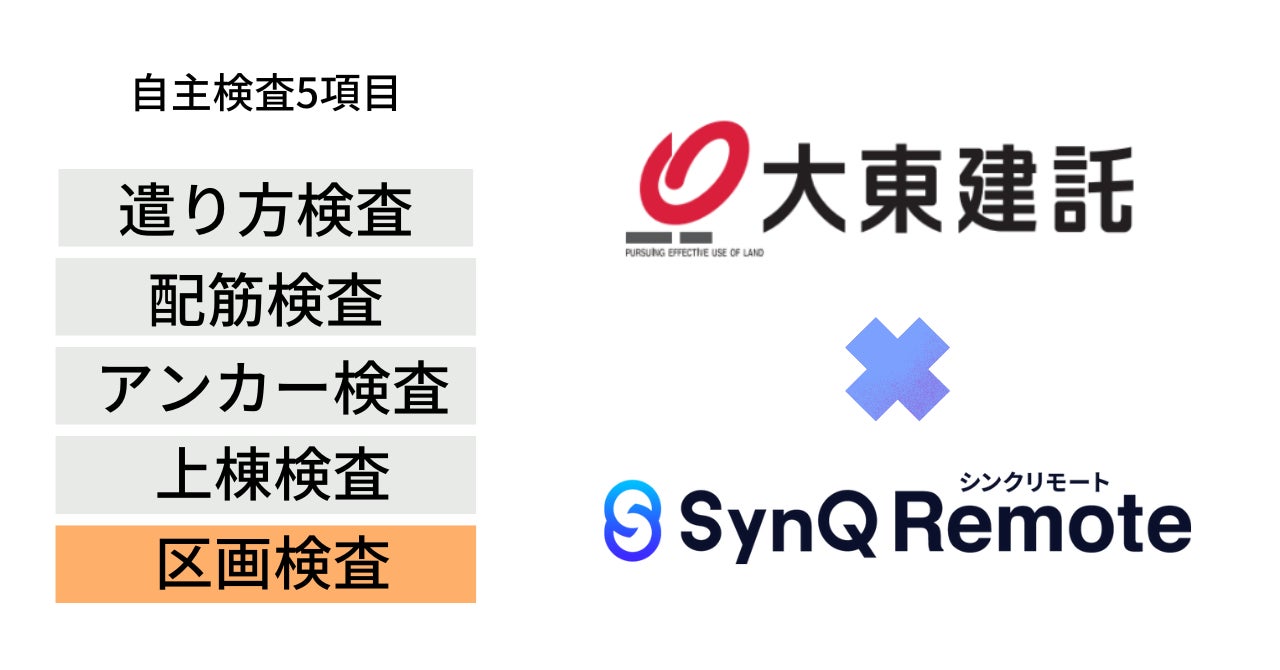 自主検査は大東建託が建築基準法に基づく中間検査と別に行う独自の検査で、建物の品質確保のための重要な工程です。全5項目のうち、まずは従来方式と同等の検査精度の維持が確認できた「区画検査」より、SynQ Remote(シンクリモート)が導入されることになりました。今後はさらに対象検査の拡大を目指していきます。