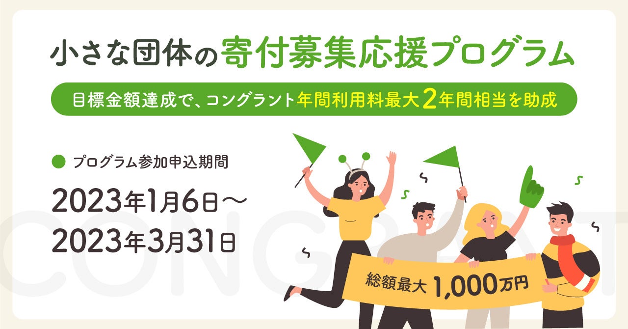 非営利組織、NPO団体のための寄付決済・支援者管理サービス「congrant(コングラント)」を提供するコングラント株式会社(代表取締役:佐藤正隆、大阪市西区)は、「小さな団体の寄付募集応援プログラム」を2023年4月から開始します。本プログラムでは、団体が目標金額を設定し、対象期間内に目標金額を達成すると、コングラント年間利用料最大2年間相当を応援資金として助成します。本プログラムの参加申込は、2023年1月6日〜3月31日までとし、本プログラムに関する説明会も開催いたします。