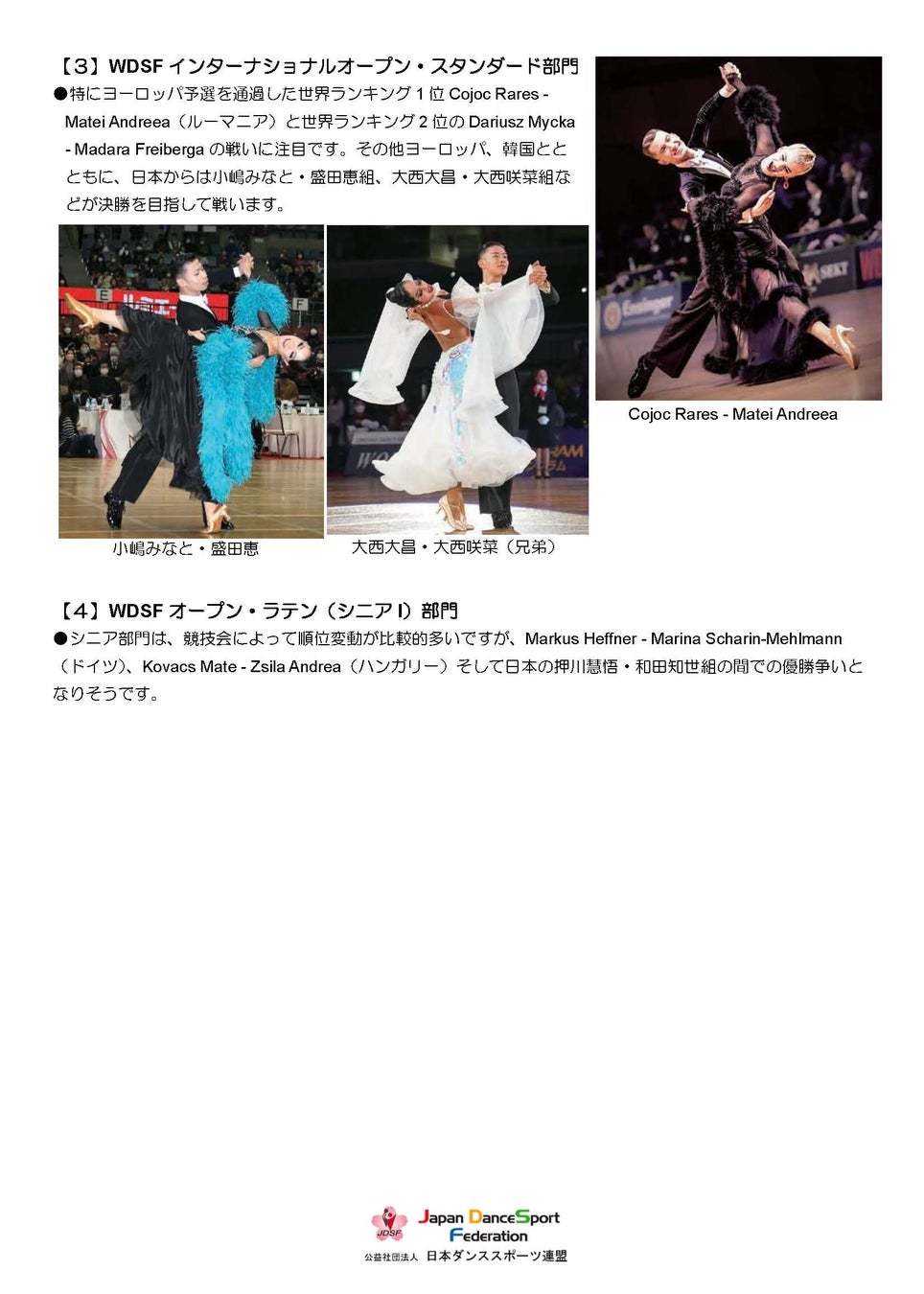 本年は、PD区分にて日本初となるWDSF世界選手権PDスタンダード部門を開催いたします。世界レベルのダンススポーツのスピードとパワーあふれるパフォーマンスが楽しめる、またとない機会になります。(※PD部門:ハイレベルなPD指導者資格を有する選手による競技部門で、完成度の高い技術の上に、より円熟した表現力が問われる)