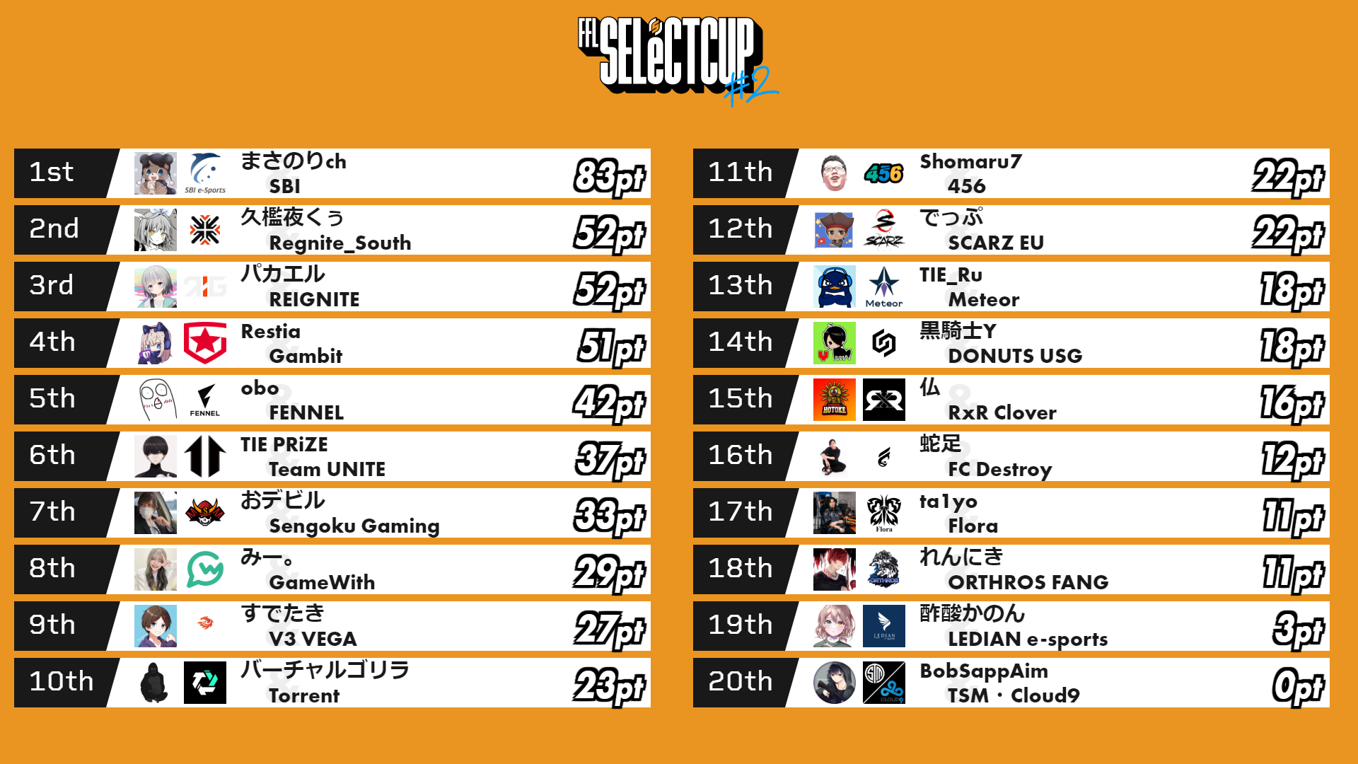 本大会はストリーマーがプロチームをドラフトしチームを構成し、5試合の合計ポイントで順位を競いました。ストリーマー枠としてTIE_Ruさんや、バーチャルゴリラさんなど実力派ストリーマーが多数出場し、プロチームとからはRIG NorthやUNITEら国内の有力チームの出場に加え、海外からEMEA(欧州地域)のGambit、NA(北米地域)からTorrentなど世界の強豪チームが参戦し当日の配信では盛り上がりを見せました。ストリーマーとプロ選手による白熱の戦いが多く見られた今大会で優勝を勝ち取ったのは「まさのりch × SBI e-Sports」チームでした。まさのりさんはこの日がご自身の誕生日であり、優勝時には配信チャット欄もお祝いムードとなりました。