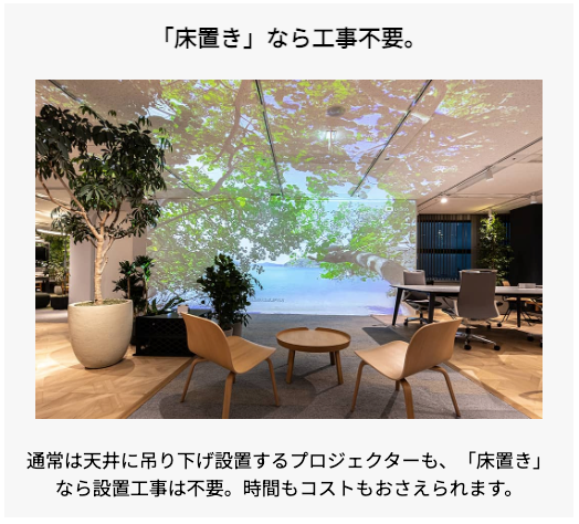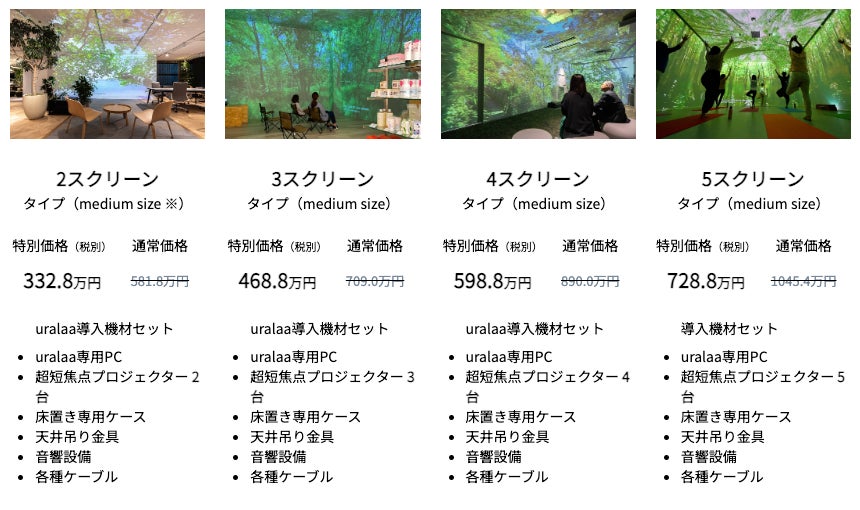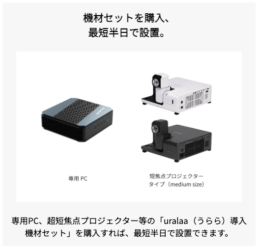uralaa専用PC、超短焦点プロジェクター、専用ケース、音響設備、各種ケーブルなどイマーシブ空間をご体験いただける機材セットを特別価格でご提供いたします。プロジェクターの床置きであれば工事不要で、すぐにご体験いただけます。