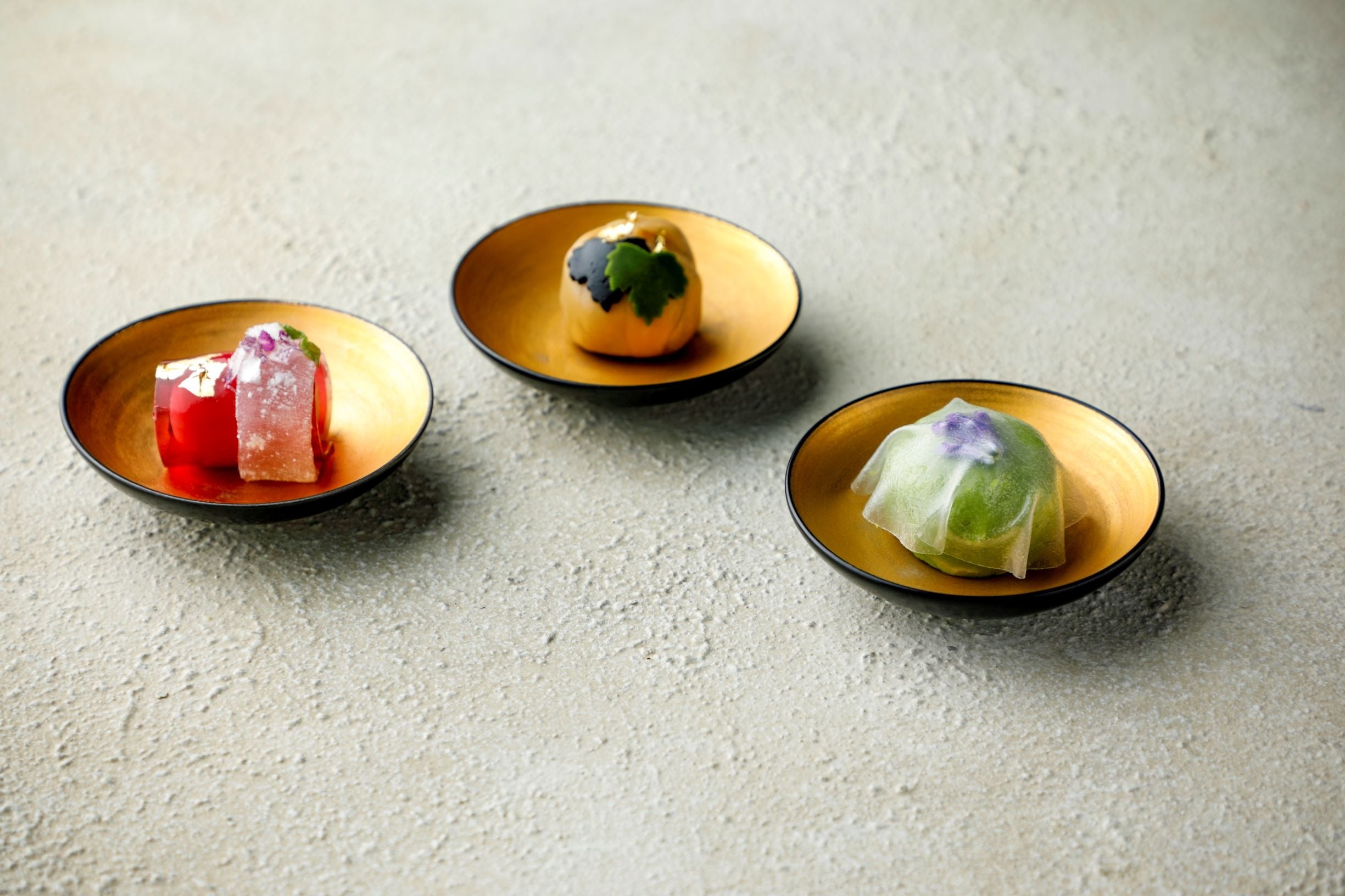 【左下】江戸琳派の奇才・鈴木其一の「藤花図」をイメージした鮮やかな赤紫の一品。白餡で包みこんだフレッシュ葡萄とクリームチーズを大原の紫蘇ジュースの寒天と求肥で巻き爽やかに仕上げました。