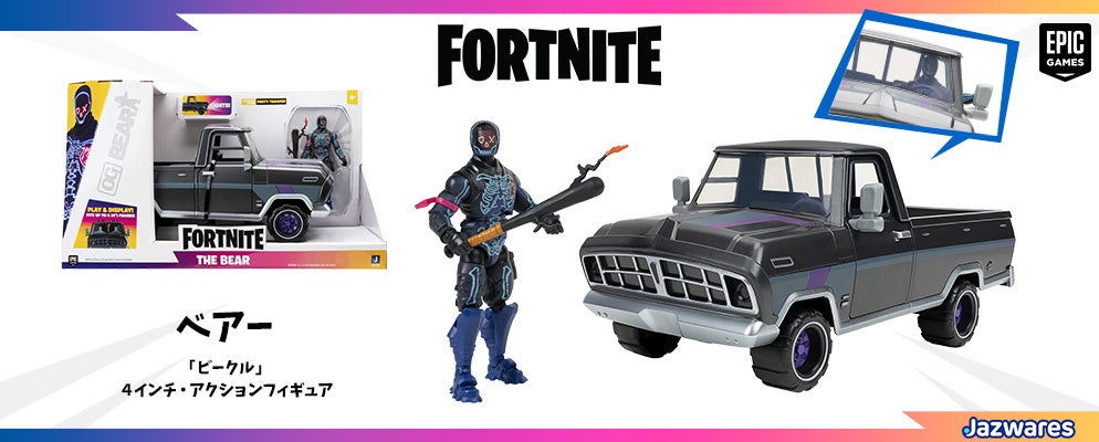『フォートナイト』に登場するビークル「ベアー」を、全長約30センチで立体化。4インチスケールに合わせたサイズで、細部に至るまで再現している。また、パーティートルーパーのアクションフィギュアが付属。アクセサリーとして、収集ツールのバッシュバーナーも付属する。本体は開閉ができ、本シリーズのアクションフィギュアと組み合わせれば、車内とテールゲート合わせて6体まで乗せることが可能!さらにライトアップ機能を搭載し、ヘッドライトが光る仕様となっている。