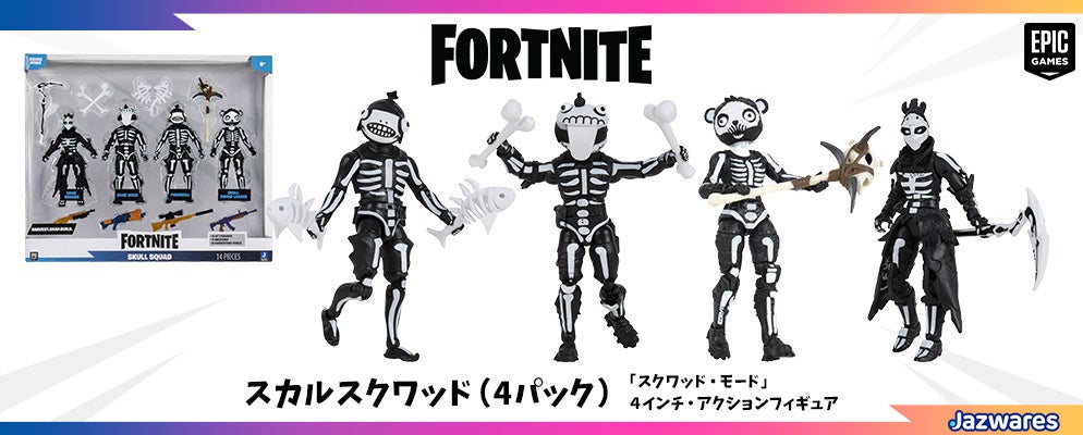 『フォートナイト』に登場するスカルスクワッドパックの4スキン(ボーンラベージ、ボーンボス、フィッシュスカル、スカルスクワッドクマちゃん)を立体化。武器として、ポンプショットガン、タクティカルショットガン、サイレンサー付きスナイパーライフル、ヘビーアサルトライフルが付属。アクセサリーとして、収集ツールのスカルシックル、ビーフボーン、ベイトボーンズ、デスバレーが付属する。豊富な武器やアクセサリーを使用すれば、さまざまなゲーム内のシーンを再現可能!