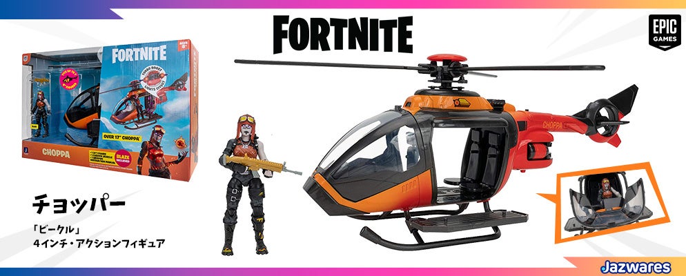 『フォートナイト』に登場するビークル「チョッパー」を、全長約43センチで立体化。4インチスケールに合わせたサイズで、細部に至るまで再現している。また、ブレイズのアクションフィギュアが付属。武器として、アサルトライフルも付属する。機体は開閉ができ、本シリーズのアクションフィギュアと組み合わせれば、機内に7体まで乗せて遊ぶことが可能!機体のテール部分は取り外しが可能。また、上部のプロペラが可動する。さらにライトアップ機能を搭載し、機体後ろのターボブーストが光る仕様となっている。