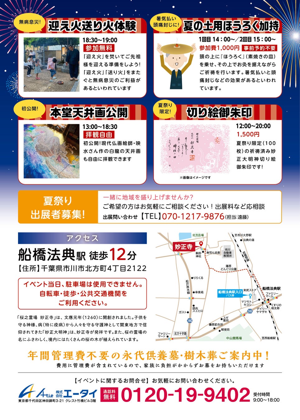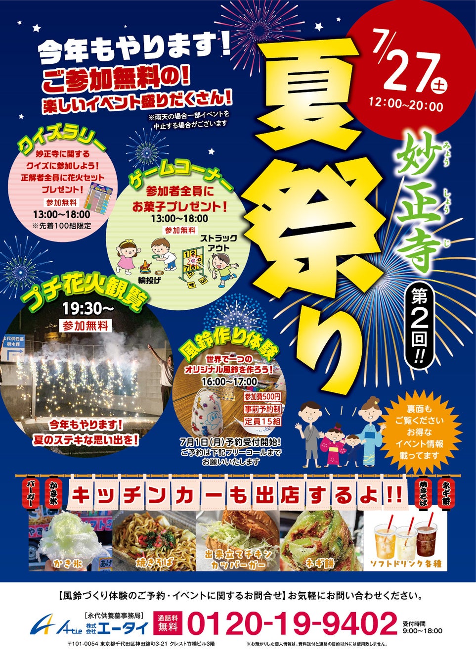 また同日は、妙正寺と寺院コンサルティングを行う株式会社エータイ(本社:東京都千代田区、代表取締役:樺山玄基、以下「当社」)の共同で、「妙正寺夏祭り」も同時開催いたします。