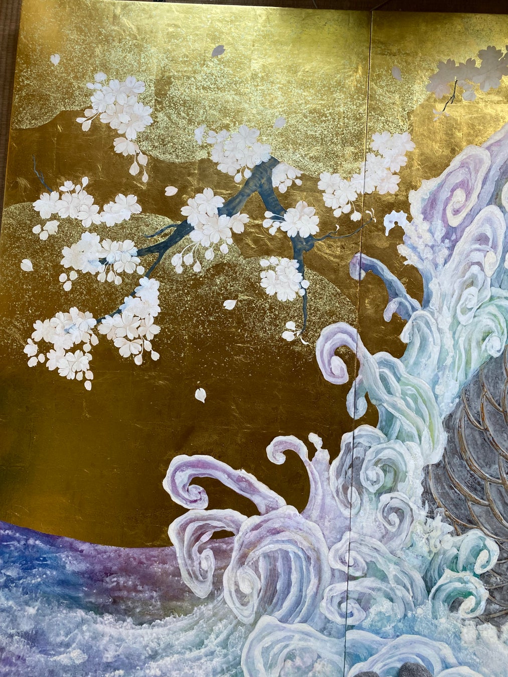 現代仏画絵師・映水さん作の天井画「白龍神桜波図」は横約8メートル、縦2.5メートルあり、約1年の制作期間を経て2024年6月に本堂に設置されました。妙正寺縁起の妙正大明神は、子どもを守る神様・疫病退散の神様として信仰されてきました。その由来ともなる「桜と龍の女神妙正伝説」に桜と龍が深く関係することから、天井画のデザインとなっています。