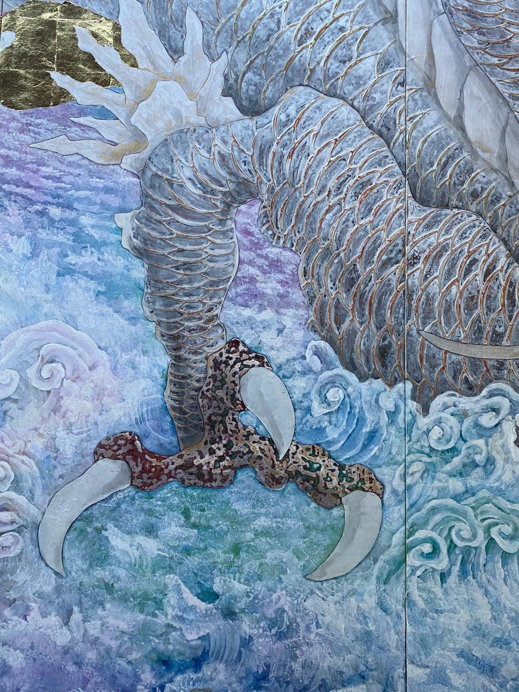 本堂に入ってすぐ迎える天井画は、白龍を中心として波や桜を見上げた時にバランス良く見えるように考えられており、白龍は寺院が長く地域に繁栄していくようにと無限の形(∞)をイメージして描かれています。