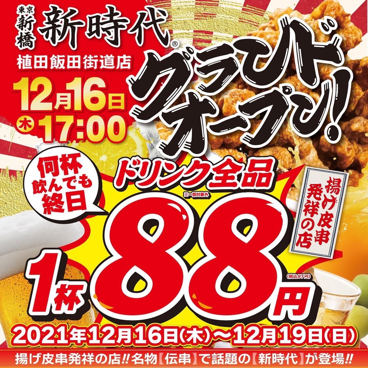 「新時代 植田飯田街道店」のオープンを記念し、ドリンク全品を1杯88円(税込97円)でお楽しみいただけるキャンペーンを開催します。一度、『新時代』にご来店頂ければ、新時代がなぜこんなにも人気なのかを分かって頂けると思います。皆様のご来店お待ち申し上げます。