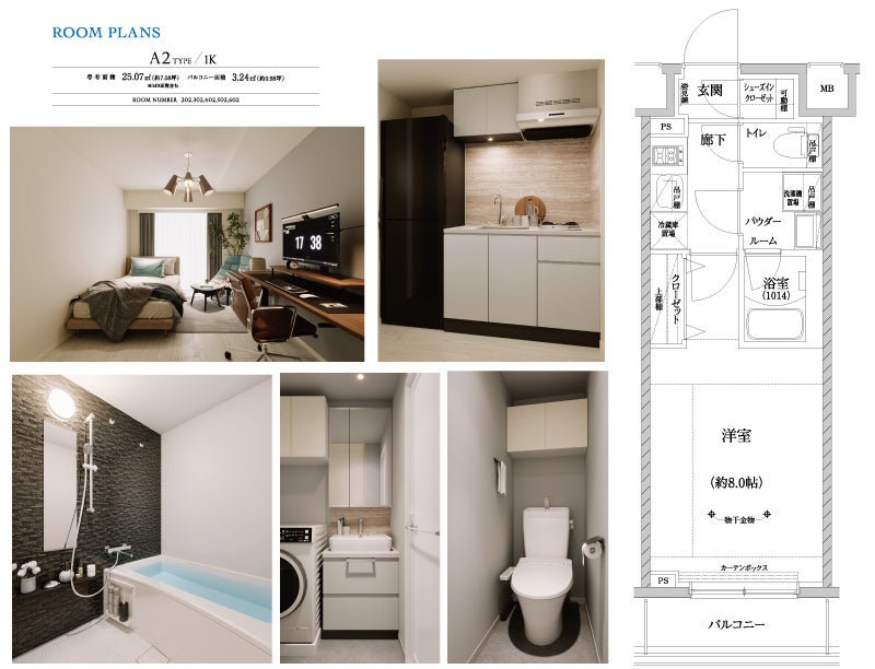 間取りは1K(25.07㎡)で構成しており、洗練された内装は穏やかな風合いで統一され品格をも感じるデザインに加え、入居者満足度を最大化する設備を厳選。美しくなめらかな質感で耐久性・清掃性に優れた人造大理石カウンターや、レバーひとつで手軽に温度調整可能なサーモスタット式混合水栓を採用しています。