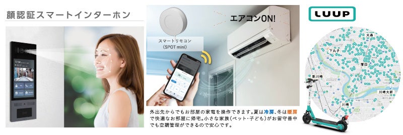 顔認証のみでエントランスを通過できるセキュアな環境に加え、外出先からスマートインターホンによる来客対応や、エアコン・照明などの家電操作が可能なIoT設備を完備。さらに敷地内には電動・小型・一人乗りのマイクロモビリティ「LUUP」のポートを設置しました。最新のテクノロジーを日常に取り入れることで、忙しい毎日をよりスマートに、より快適にサポートする住環境を提供します。
